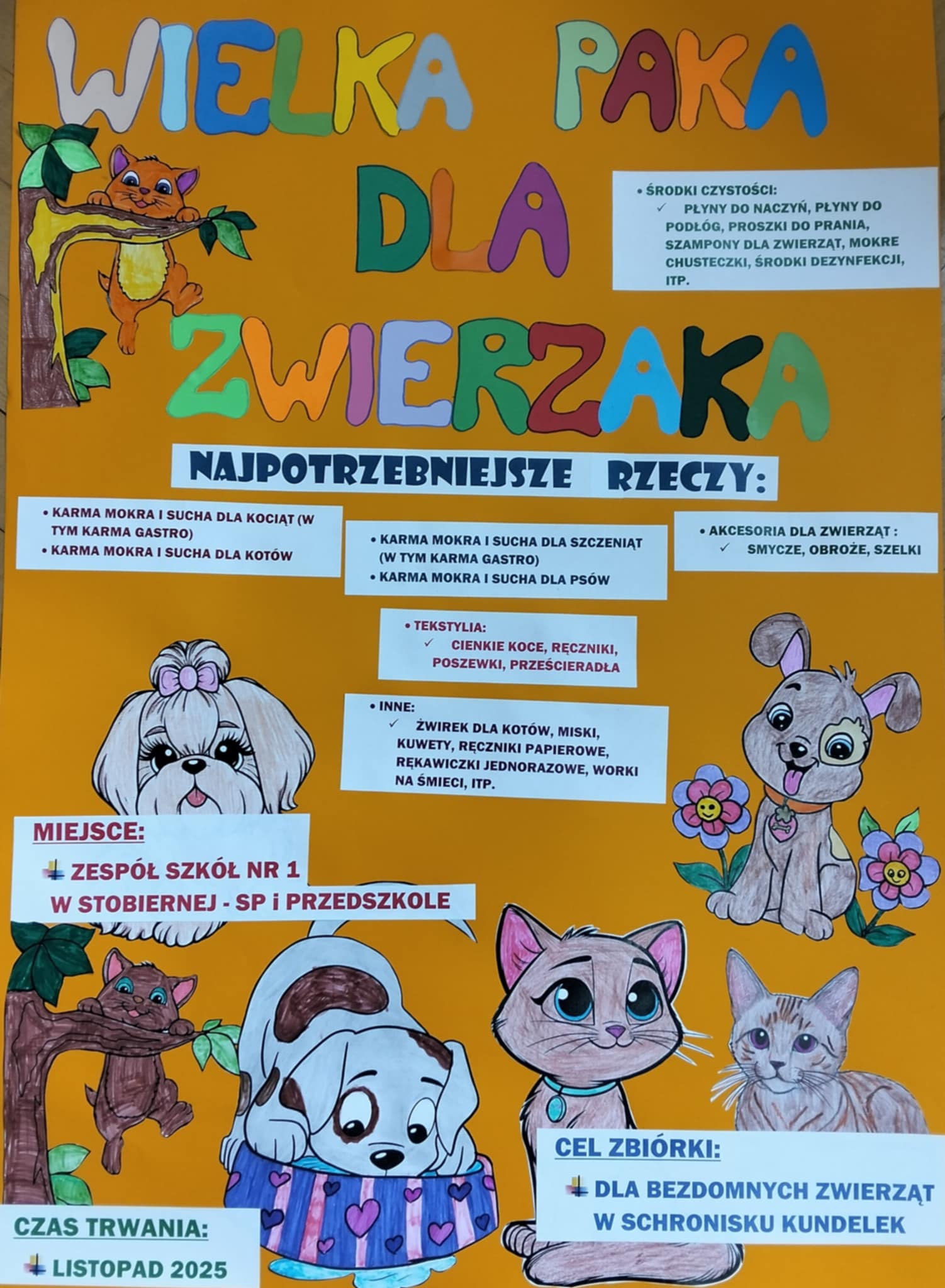 ![]() Potrzebne są m.in. karma, koce, ręczniki i miski – każdy gest ma znaczenie! ![]() ![]() Szczegółowe informacje znajdziecie na plakatach w szkole!