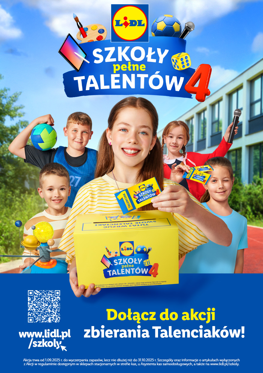 Małgorzata Szybisty Drodzy Uczniowie i Rodzice! Nasza szkoła po raz kolejny dołączyła do akcji Lidla „Szkoły pełne talentów”. Zachęcamy do aktywnego wsparcia naszej placówki – każdy przekazany „talenciak” ma znaczenie! Co należy zrobić? 1. Wrzuć talenciaka do pudełka, które znajduje się: - przy sekretariacie - w szatni w przedszkolu - na górnym korytarzu naprzeciwko automatu 2. Samodzielnie zeskanuj kod QR lub przepisz unikatowy kod na stronie: https://szkoly.lidl.pl/Talenciaki/daneSzkoly/87040009505