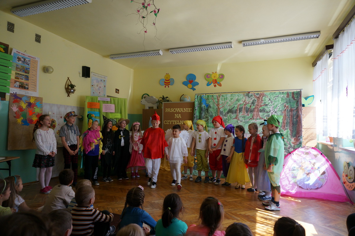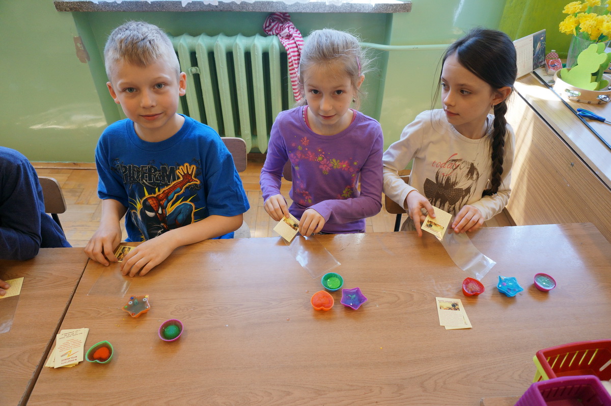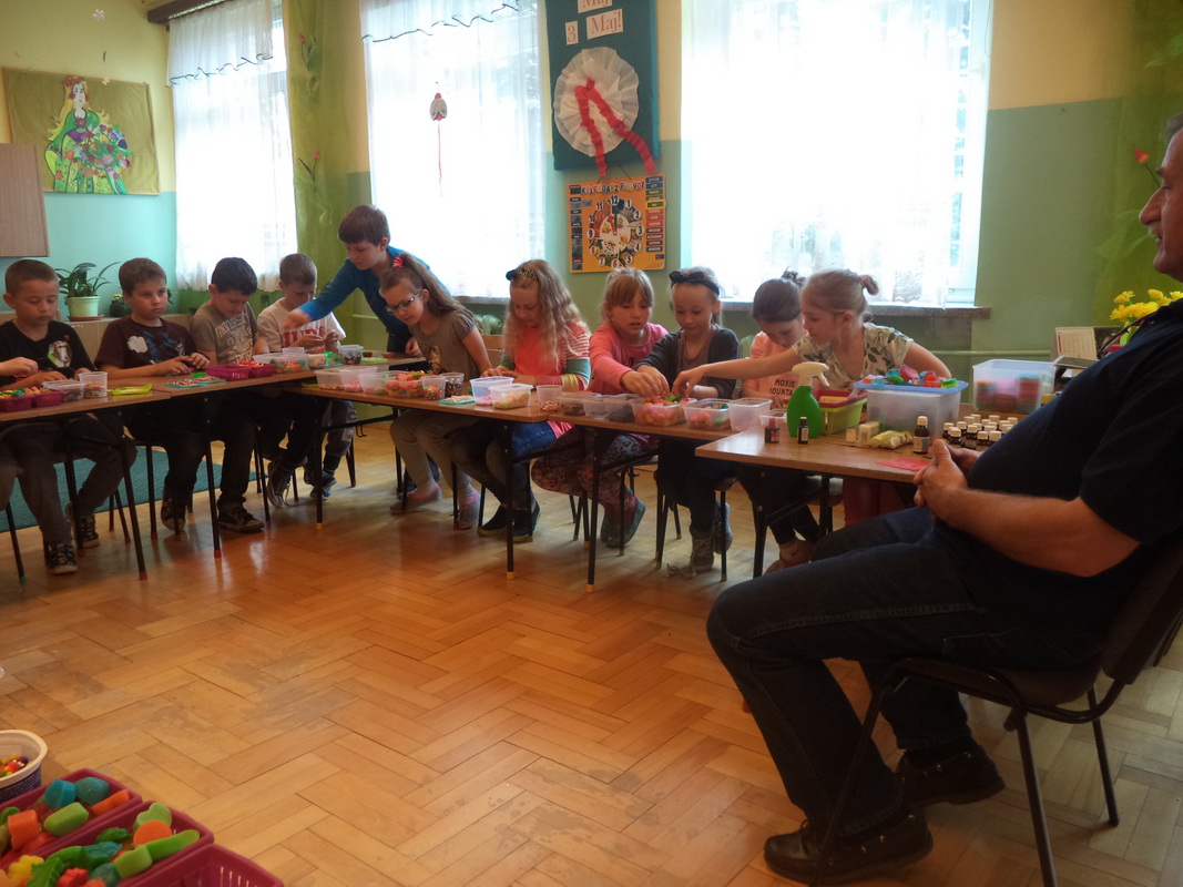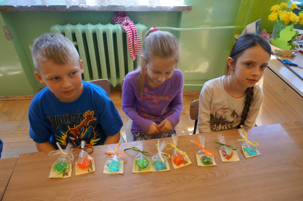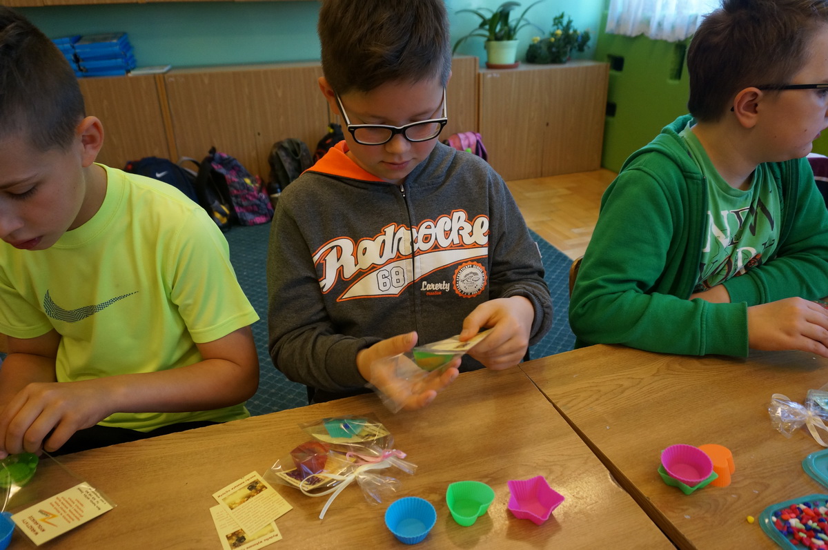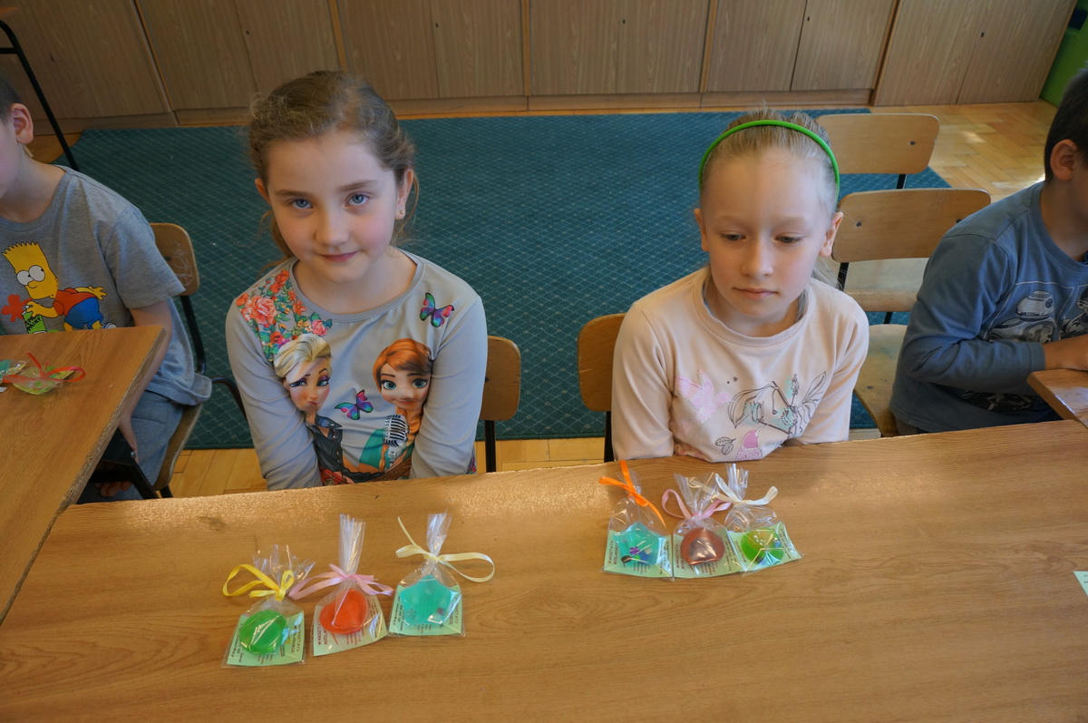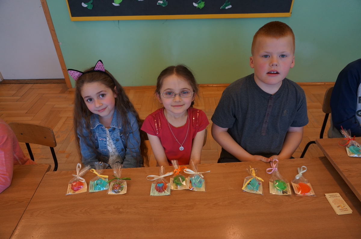 Pasowanie uczniów klas pierwszych na czytelników biblioteki na stałe wpisało się do kalendarza uroczystości szkolnych. Zazwyczaj uroczystość ta odbywa się w II semestrze, kiedy uczniowie znają już prawie cały alfabet. Pierwsze spotkanie z biblioteką szkolną to wyjątkowa uroczystość, a pierwsza wypożyczona książka powinna być na długo zapamiętana. Specjalnie na tę okazję została przygotowana krótka część artystyczna, pt.'' Spotkanie bajek" w wykonaniu uczniów z klasy IIa. Na scenie zobaczyliśmy między innymi krasnoludki, Jasia i Małgosię, Babę Jagę, Śnieżkę, Czerwonego Kapturka, wilka, Kopciuszka oraz Calineczkę. Uczniowie klas pierwszych doskonale poradzili sobiez bajkowymi zagadkami, które sprawdziły ich znajomość bohaterów baśni i bajek. Następnie pani Irena Bielawska zapoznała wszystkich z regulaminem biblioteki, przypominając o ważnych zasadach, które należy przestrzegać oraz sposobie wypożyczania. Skupione i poważne pierwszaki w obecności pani dyrektor Beaty Kowal i wice dyrektor Marii Skały uroczyście przyrzekły, że będą kochać i szanować książki, korzystać z ich mądrości i sumiennie wypełniać obowiązki czytelnika. Po przyrzeczeniu nastąpiło uroczyste pasowanie, którego dokonała pani dyrektor. Jednocześnie pogratulowała wszystkim uczniom i życzyła wspaniałych przygód w świecie książek. Wręczyła też pamiątkowe dyplomy oraz zakładki. Dnia 5 i 6 maja 2016r. odbyły się w naszej szkole warsztaty mydlarskie, w których udział wzięli uczniowie z klas 1-3. Mieli okazję dowiedzieć się jak wygląda produkcja mydła oraz wysłuchać historii jego powstania. Podczas zajęć uczestnicy samodzielnie wykonywali mydełka o rozmaitych zapachach, wzorach i kolorach. Wszyscy z ochotą tworzyli własne kompozycje zapachowe, wykorzystując do tego glicerynę, olejki zapachowe oraz elementy dekoracyjne. W całej szkole wspaniale pachniało, a pięknie zapakowane mydełka stanowiły oryginalny prezent.