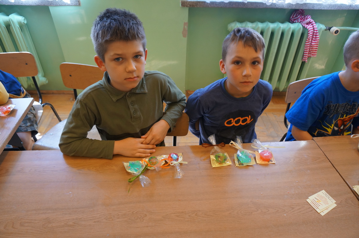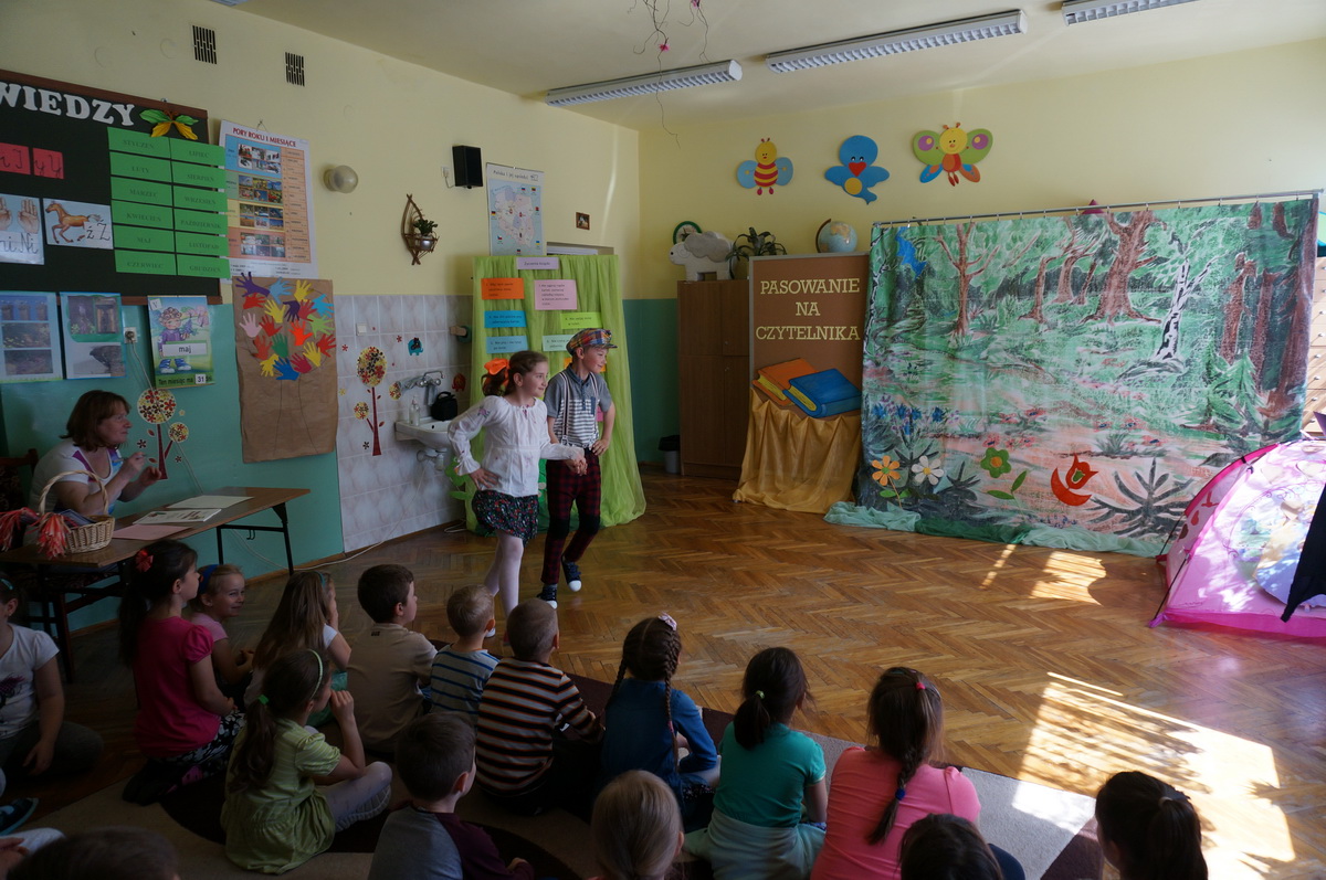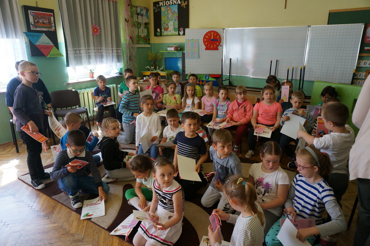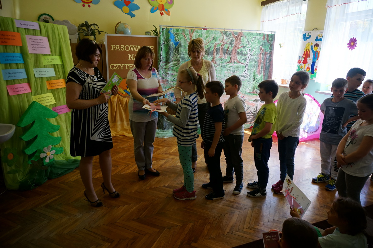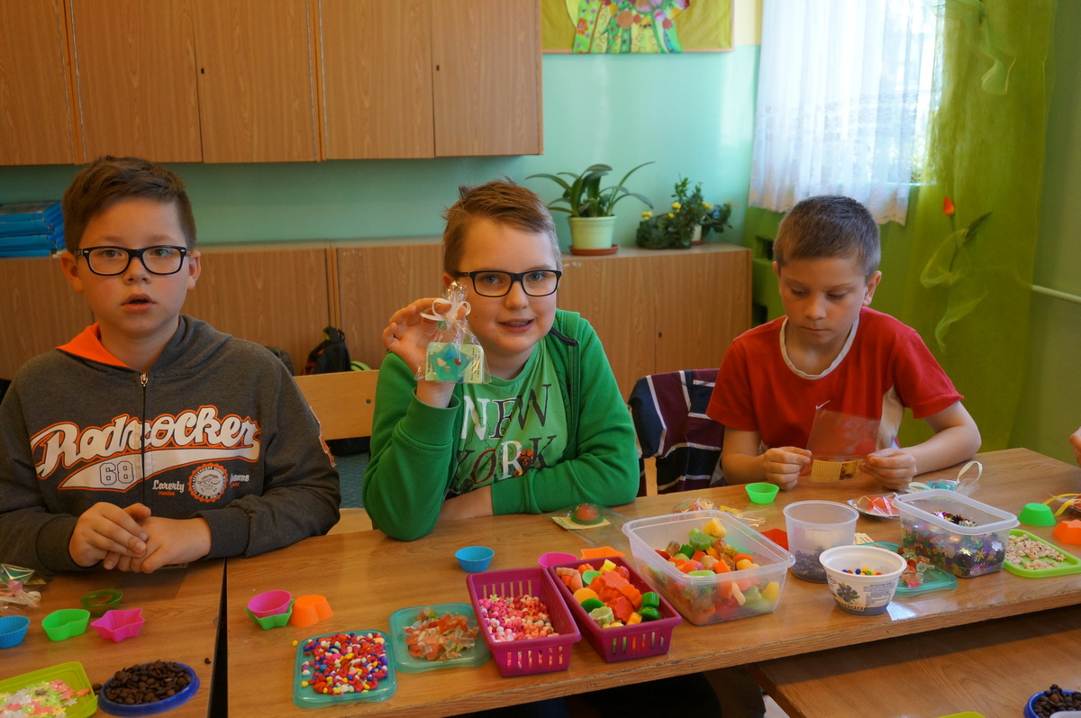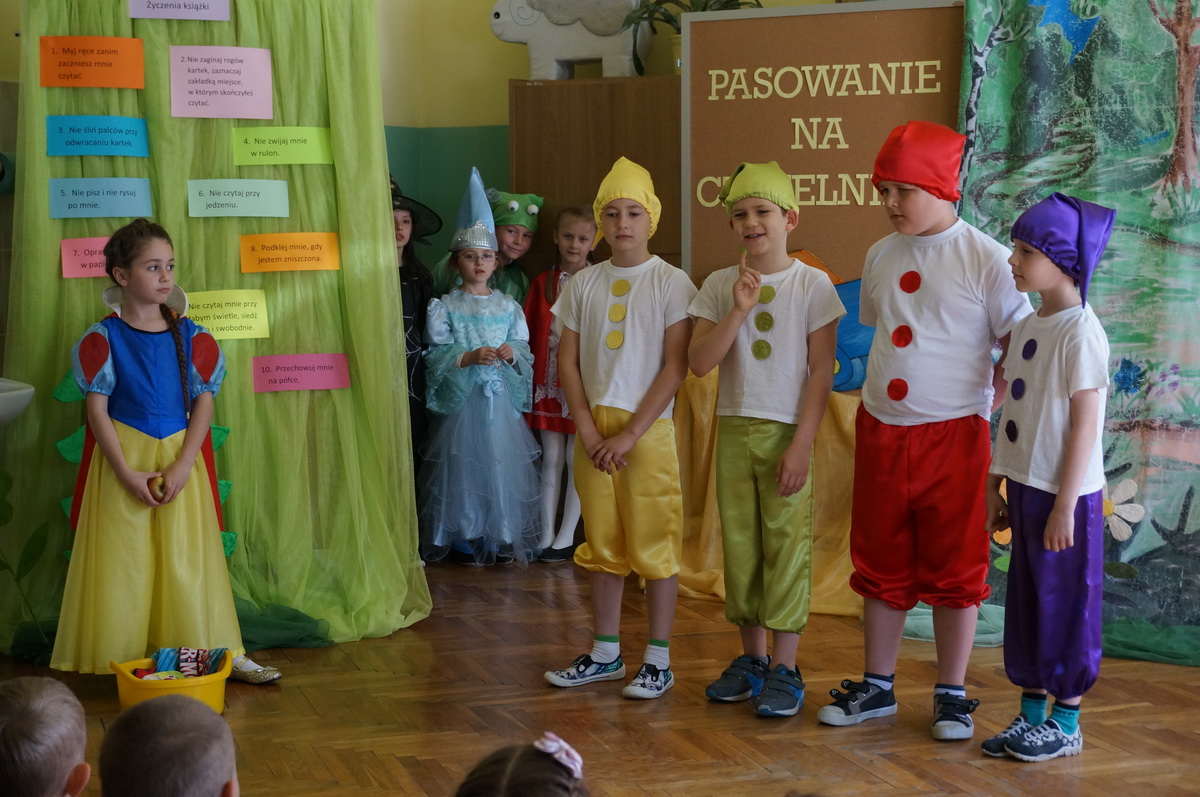 Pasowanie uczniów klas pierwszych na czytelników biblioteki na stałe wpisało się do kalendarza uroczystości szkolnych. Zazwyczaj uroczystość ta odbywa się w II semestrze, kiedy uczniowie znają już prawie cały alfabet. Pierwsze spotkanie z biblioteką szkolną to wyjątkowa uroczystość, a pierwsza wypożyczona książka powinna być na długo zapamiętana. Specjalnie na tę okazję została przygotowana krótka część artystyczna, pt.'' Spotkanie bajek" w wykonaniu uczniów z klasy IIa. Na scenie zobaczyliśmy między innymi krasnoludki, Jasia i Małgosię, Babę Jagę, Śnieżkę, Czerwonego Kapturka, wilka, Kopciuszka oraz Calineczkę. Uczniowie klas pierwszych doskonale poradzili sobiez bajkowymi zagadkami, które sprawdziły ich znajomość bohaterów baśni i bajek. Następnie pani Irena Bielawska zapoznała wszystkich z regulaminem biblioteki, przypominając o ważnych zasadach, które należy przestrzegać oraz sposobie wypożyczania. Skupione i poważne pierwszaki w obecności pani dyrektor Beaty Kowal i wice dyrektor Marii Skały uroczyście przyrzekły, że będą kochać i szanować książki, korzystać z ich mądrości i sumiennie wypełniać obowiązki czytelnika. Po przyrzeczeniu nastąpiło uroczyste pasowanie, którego dokonała pani dyrektor. Jednocześnie pogratulowała wszystkim uczniom i życzyła wspaniałych przygód w świecie książek. Wręczyła też pamiątkowe dyplomy oraz zakładki. Dnia 5 i 6 maja 2016r. odbyły się w naszej szkole warsztaty mydlarskie, w których udział wzięli uczniowie z klas 1-3. Mieli okazję dowiedzieć się jak wygląda produkcja mydła oraz wysłuchać historii jego powstania. Podczas zajęć uczestnicy samodzielnie wykonywali mydełka o rozmaitych zapachach, wzorach i kolorach. Wszyscy z ochotą tworzyli własne kompozycje zapachowe, wykorzystując do tego glicerynę, olejki zapachowe oraz elementy dekoracyjne. W całej szkole wspaniale pachniało, a pięknie zapakowane mydełka stanowiły oryginalny prezent.