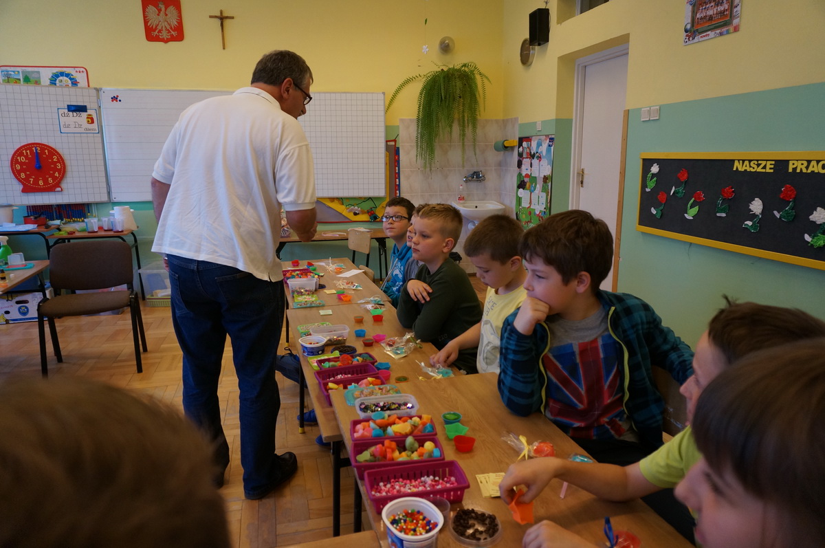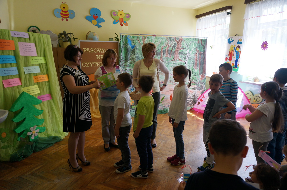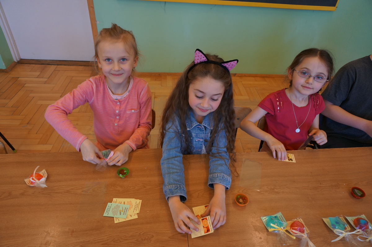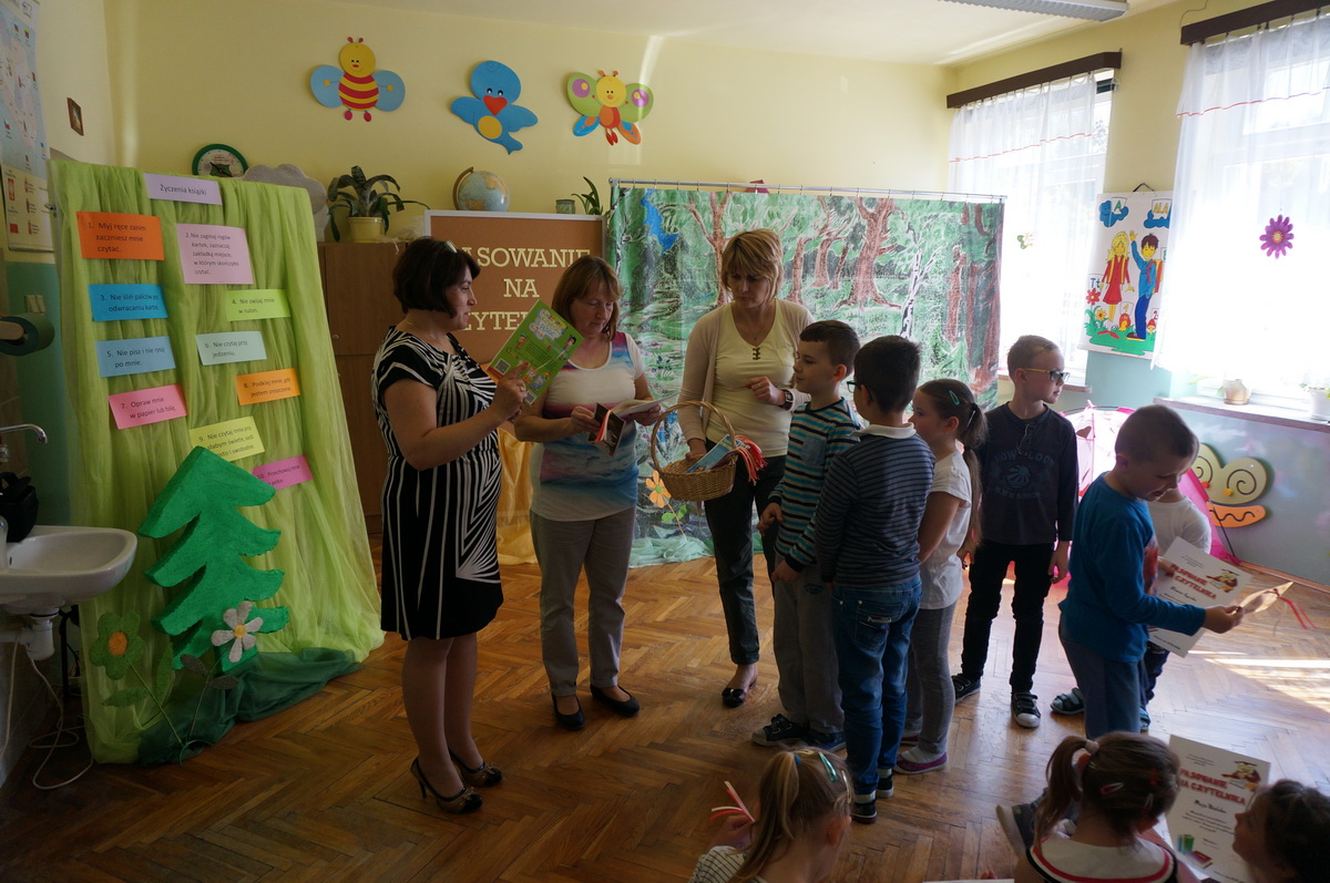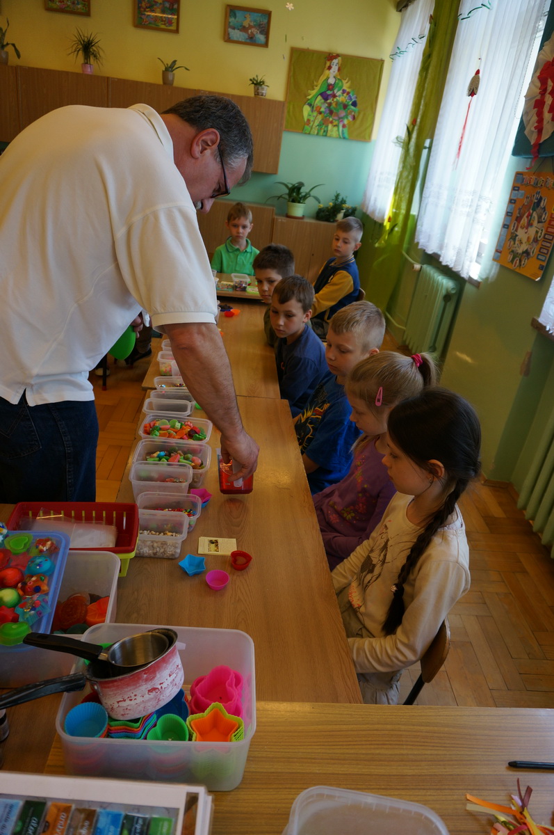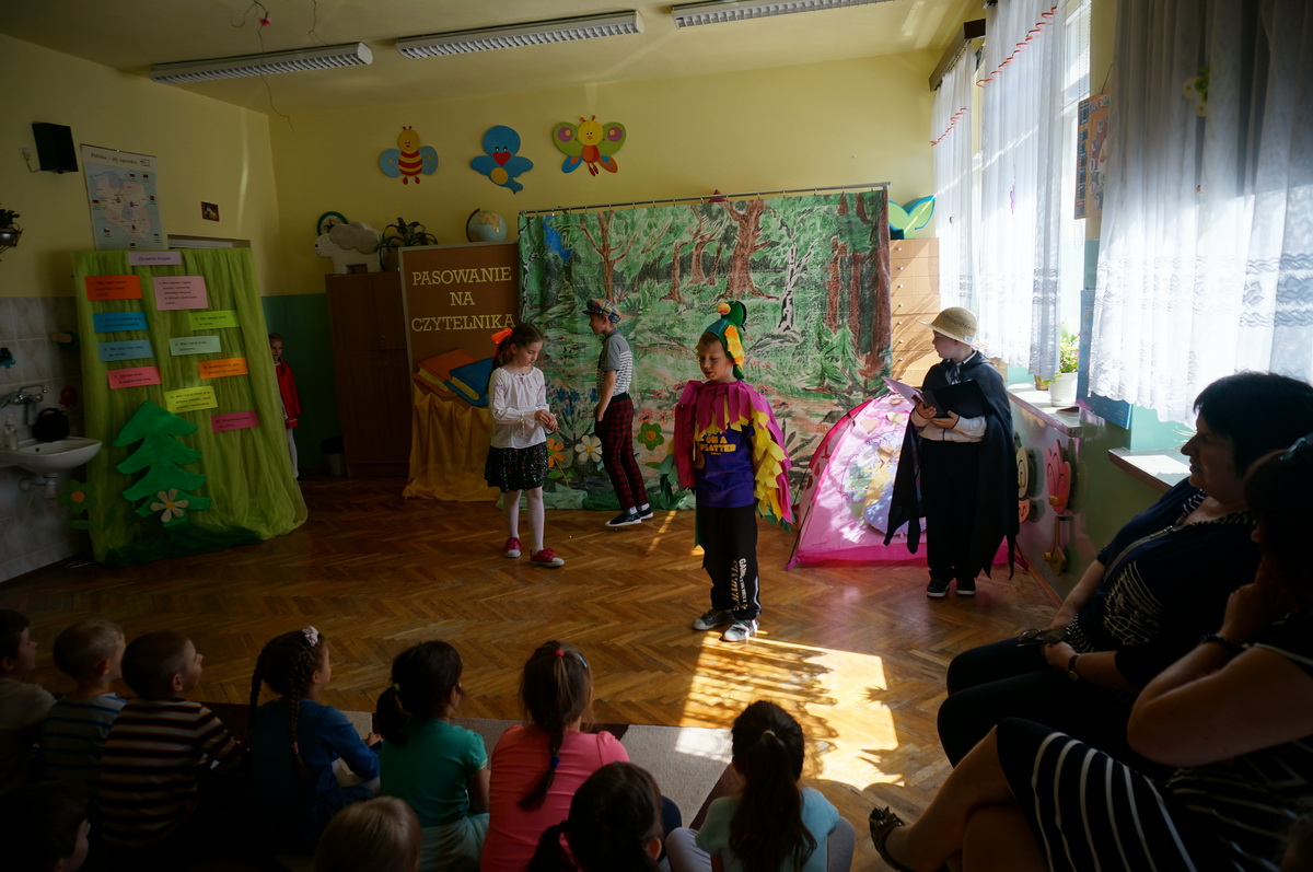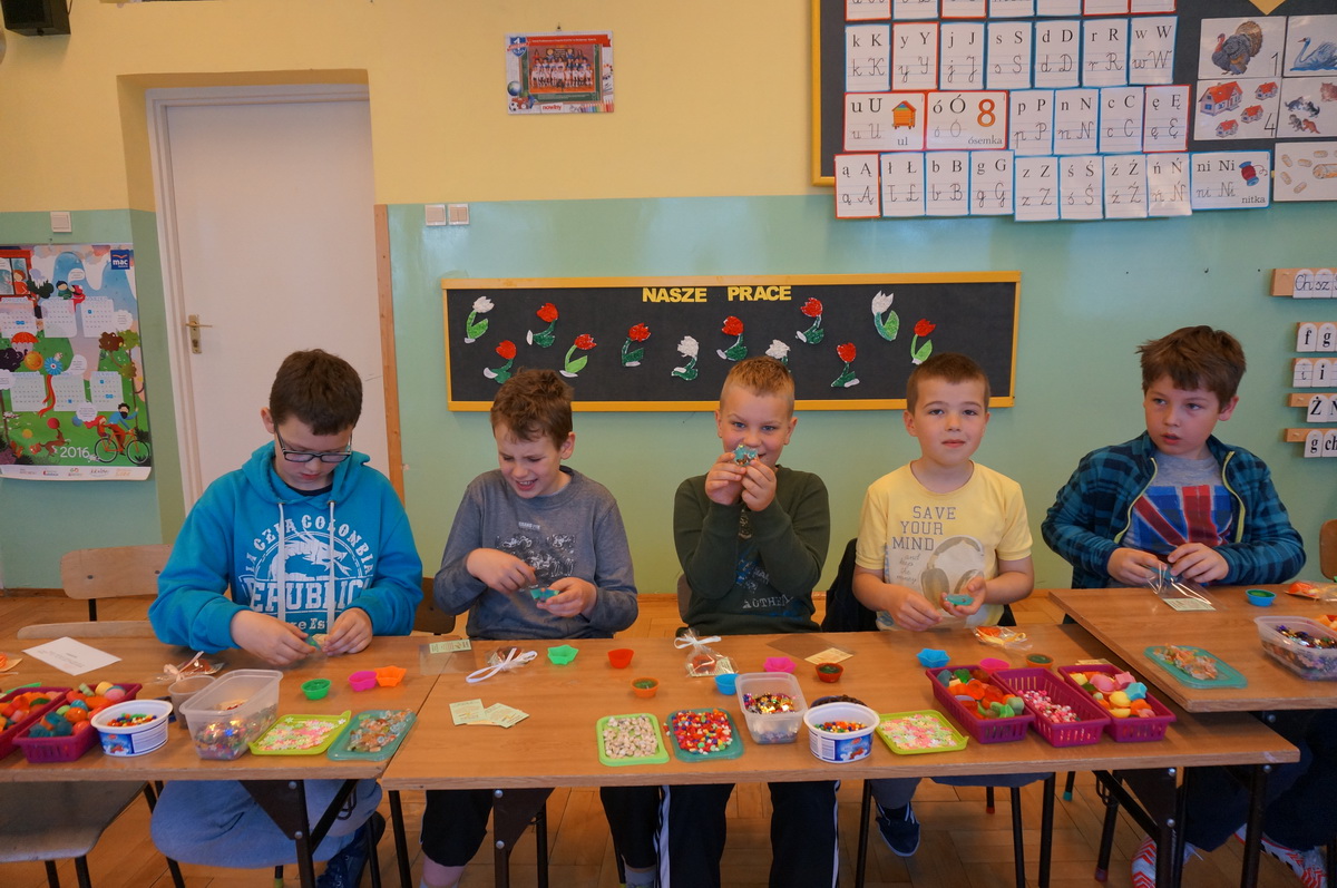 Pasowanie uczniów klas pierwszych na czytelników biblioteki na stałe wpisało się do kalendarza uroczystości szkolnych. Zazwyczaj uroczystość ta odbywa się w II semestrze, kiedy uczniowie znają już prawie cały alfabet. Pierwsze spotkanie z biblioteką szkolną to wyjątkowa uroczystość, a pierwsza wypożyczona książka powinna być na długo zapamiętana. Specjalnie na tę okazję została przygotowana krótka część artystyczna, pt.'' Spotkanie bajek" w wykonaniu uczniów z klasy IIa. Na scenie zobaczyliśmy między innymi krasnoludki, Jasia i Małgosię, Babę Jagę, Śnieżkę, Czerwonego Kapturka, wilka, Kopciuszka oraz Calineczkę. Uczniowie klas pierwszych doskonale poradzili sobiez bajkowymi zagadkami, które sprawdziły ich znajomość bohaterów baśni i bajek. Następnie pani Irena Bielawska zapoznała wszystkich z regulaminem biblioteki, przypominając o ważnych zasadach, które należy przestrzegać oraz sposobie wypożyczania. Skupione i poważne pierwszaki w obecności pani dyrektor Beaty Kowal i wice dyrektor Marii Skały uroczyście przyrzekły, że będą kochać i szanować książki, korzystać z ich mądrości i sumiennie wypełniać obowiązki czytelnika. Po przyrzeczeniu nastąpiło uroczyste pasowanie, którego dokonała pani dyrektor. Jednocześnie pogratulowała wszystkim uczniom i życzyła wspaniałych przygód w świecie książek. Wręczyła też pamiątkowe dyplomy oraz zakładki. Dnia 5 i 6 maja 2016r. odbyły się w naszej szkole warsztaty mydlarskie, w których udział wzięli uczniowie z klas 1-3. Mieli okazję dowiedzieć się jak wygląda produkcja mydła oraz wysłuchać historii jego powstania. Podczas zajęć uczestnicy samodzielnie wykonywali mydełka o rozmaitych zapachach, wzorach i kolorach. Wszyscy z ochotą tworzyli własne kompozycje zapachowe, wykorzystując do tego glicerynę, olejki zapachowe oraz elementy dekoracyjne. W całej szkole wspaniale pachniało, a pięknie zapakowane mydełka stanowiły oryginalny prezent.