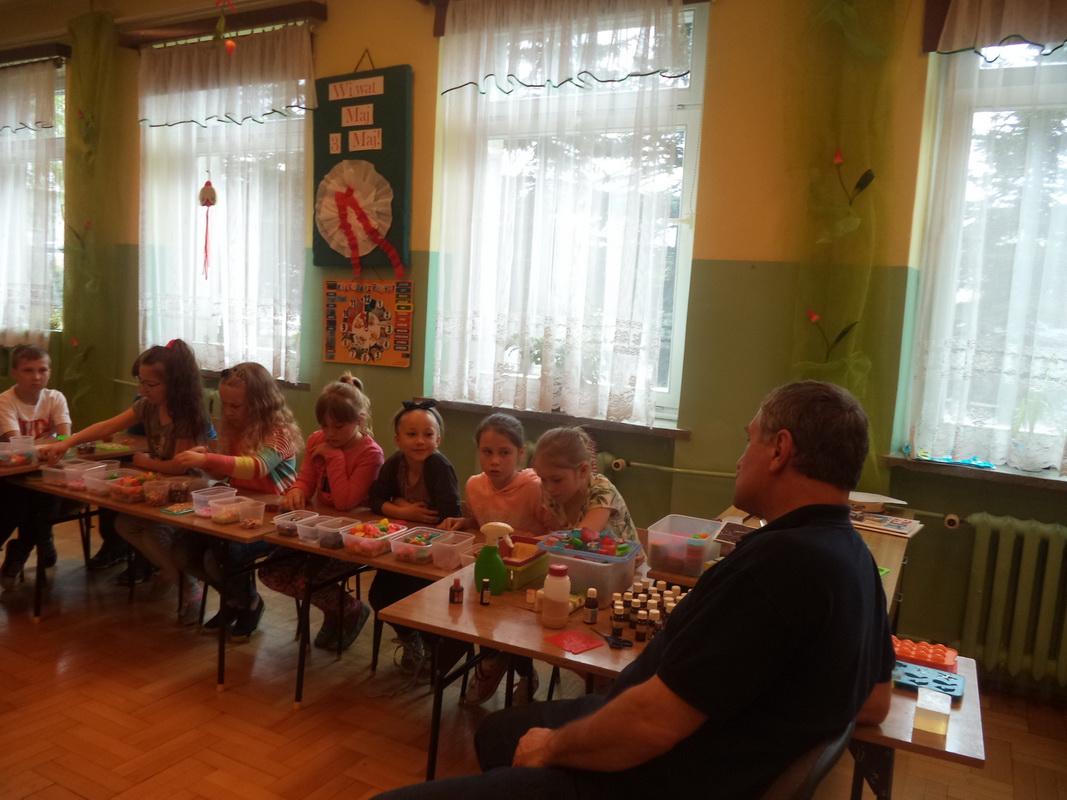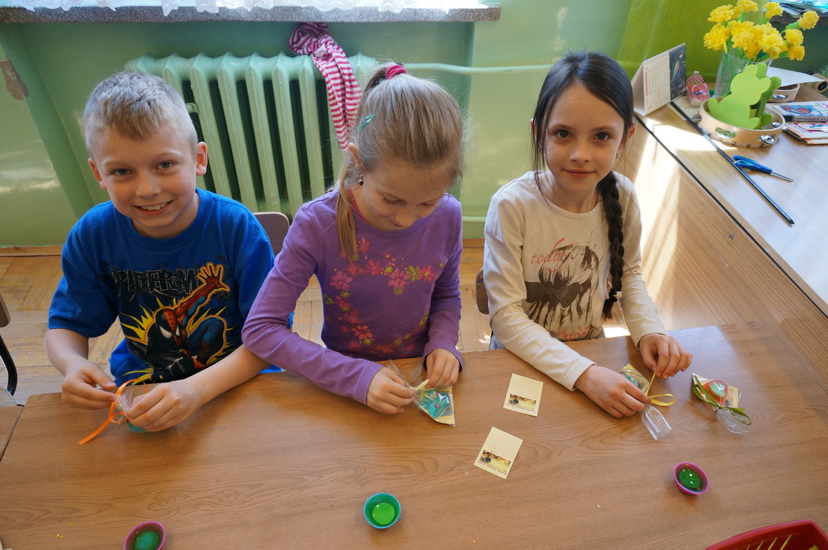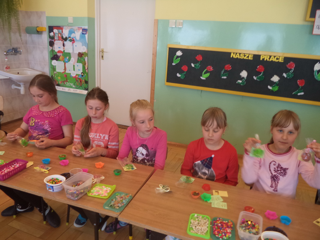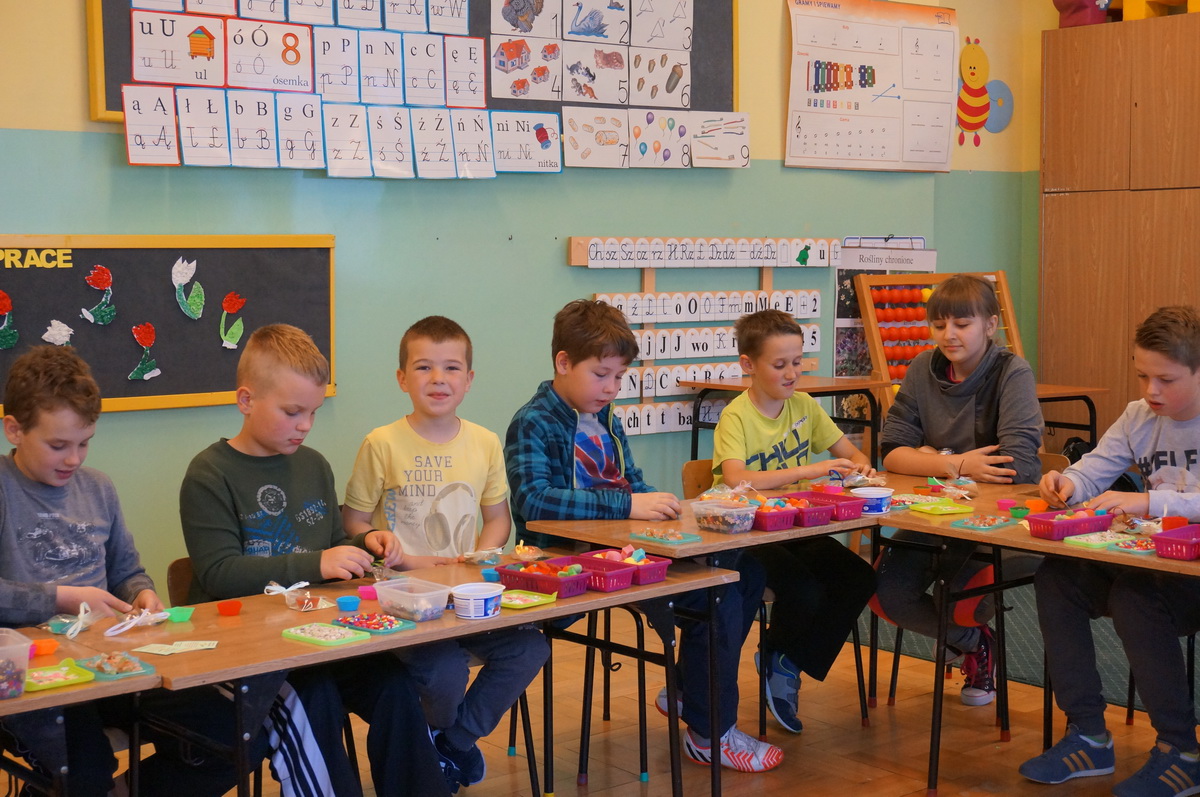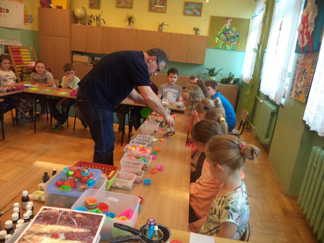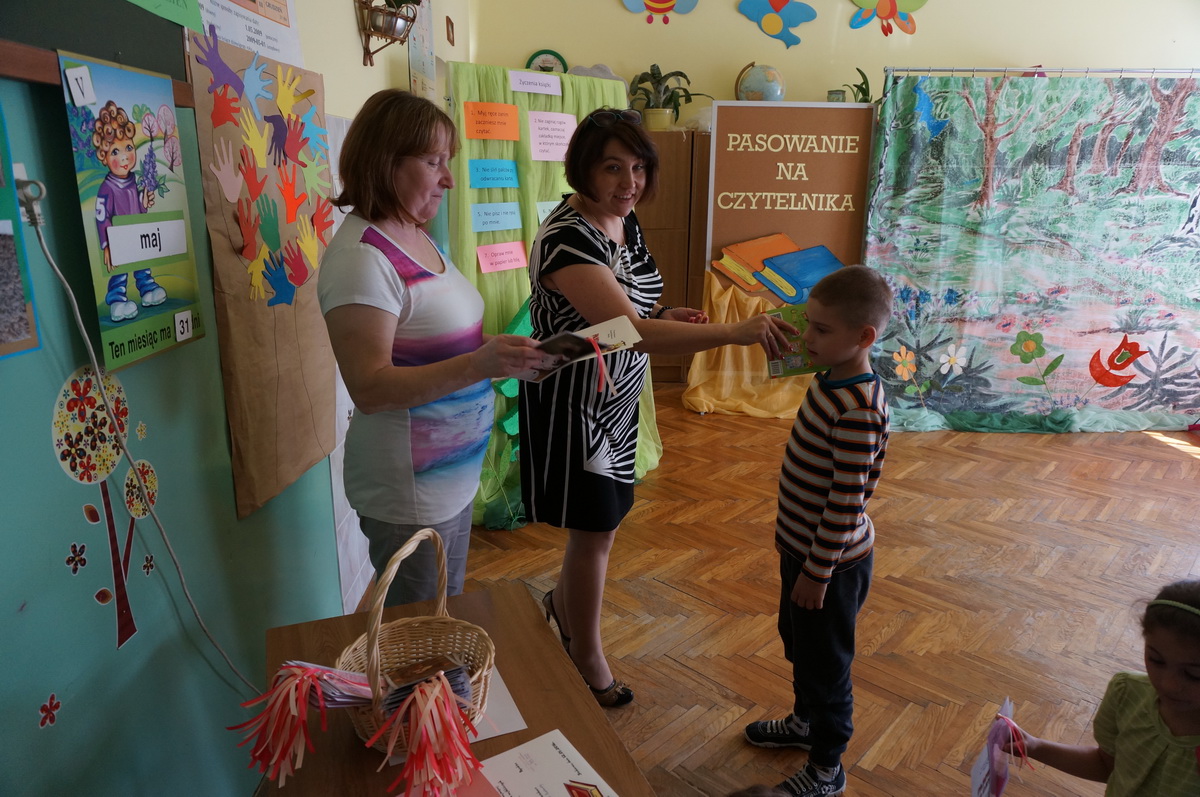 Pasowanie uczniów klas pierwszych na czytelników biblioteki na stałe wpisało się do kalendarza uroczystości szkolnych. Zazwyczaj uroczystość ta odbywa się w II semestrze, kiedy uczniowie znają już prawie cały alfabet. Pierwsze spotkanie z biblioteką szkolną to wyjątkowa uroczystość, a pierwsza wypożyczona książka powinna być na długo zapamiętana. Specjalnie na tę okazję została przygotowana krótka część artystyczna, pt.'' Spotkanie bajek" w wykonaniu uczniów z klasy IIa. Na scenie zobaczyliśmy między innymi krasnoludki, Jasia i Małgosię, Babę Jagę, Śnieżkę, Czerwonego Kapturka, wilka, Kopciuszka oraz Calineczkę. Uczniowie klas pierwszych doskonale poradzili sobiez bajkowymi zagadkami, które sprawdziły ich znajomość bohaterów baśni i bajek. Następnie pani Irena Bielawska zapoznała wszystkich z regulaminem biblioteki, przypominając o ważnych zasadach, które należy przestrzegać oraz sposobie wypożyczania. Skupione i poważne pierwszaki w obecności pani dyrektor Beaty Kowal i wice dyrektor Marii Skały uroczyście przyrzekły, że będą kochać i szanować książki, korzystać z ich mądrości i sumiennie wypełniać obowiązki czytelnika. Po przyrzeczeniu nastąpiło uroczyste pasowanie, którego dokonała pani dyrektor. Jednocześnie pogratulowała wszystkim uczniom i życzyła wspaniałych przygód w świecie książek. Wręczyła też pamiątkowe dyplomy oraz zakładki. Dnia 5 i 6 maja 2016r. odbyły się w naszej szkole warsztaty mydlarskie, w których udział wzięli uczniowie z klas 1-3. Mieli okazję dowiedzieć się jak wygląda produkcja mydła oraz wysłuchać historii jego powstania. Podczas zajęć uczestnicy samodzielnie wykonywali mydełka o rozmaitych zapachach, wzorach i kolorach. Wszyscy z ochotą tworzyli własne kompozycje zapachowe, wykorzystując do tego glicerynę, olejki zapachowe oraz elementy dekoracyjne. W całej szkole wspaniale pachniało, a pięknie zapakowane mydełka stanowiły oryginalny prezent.
