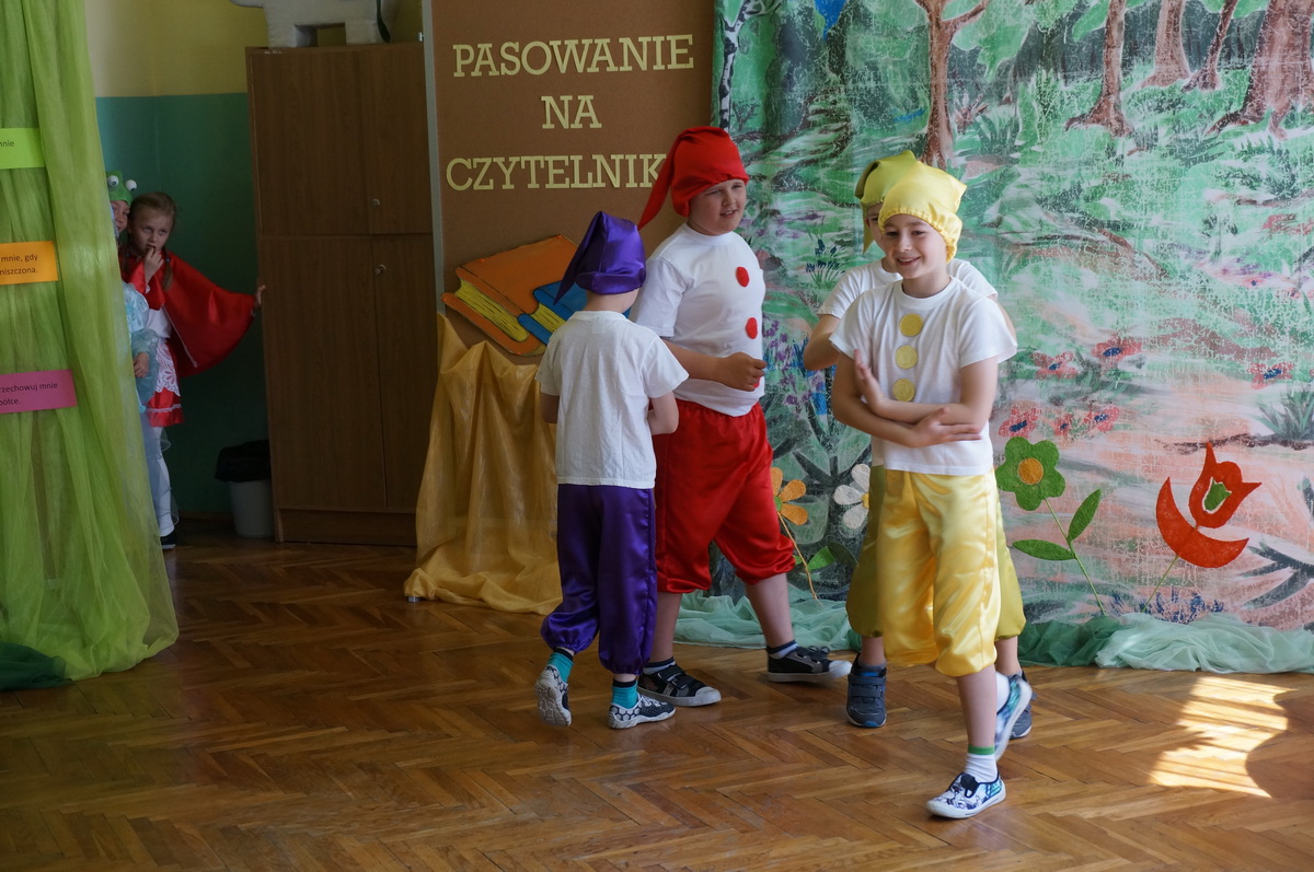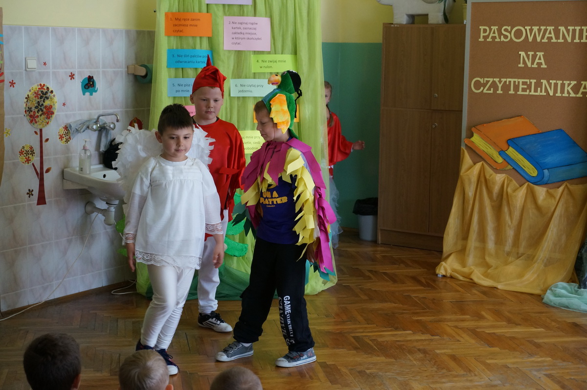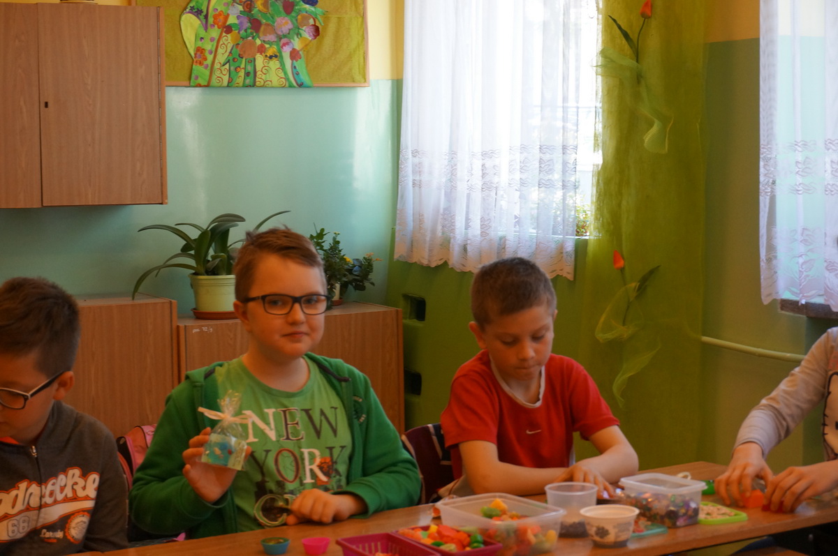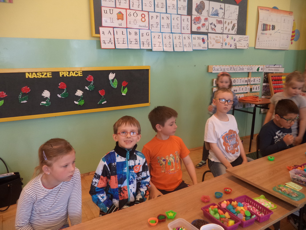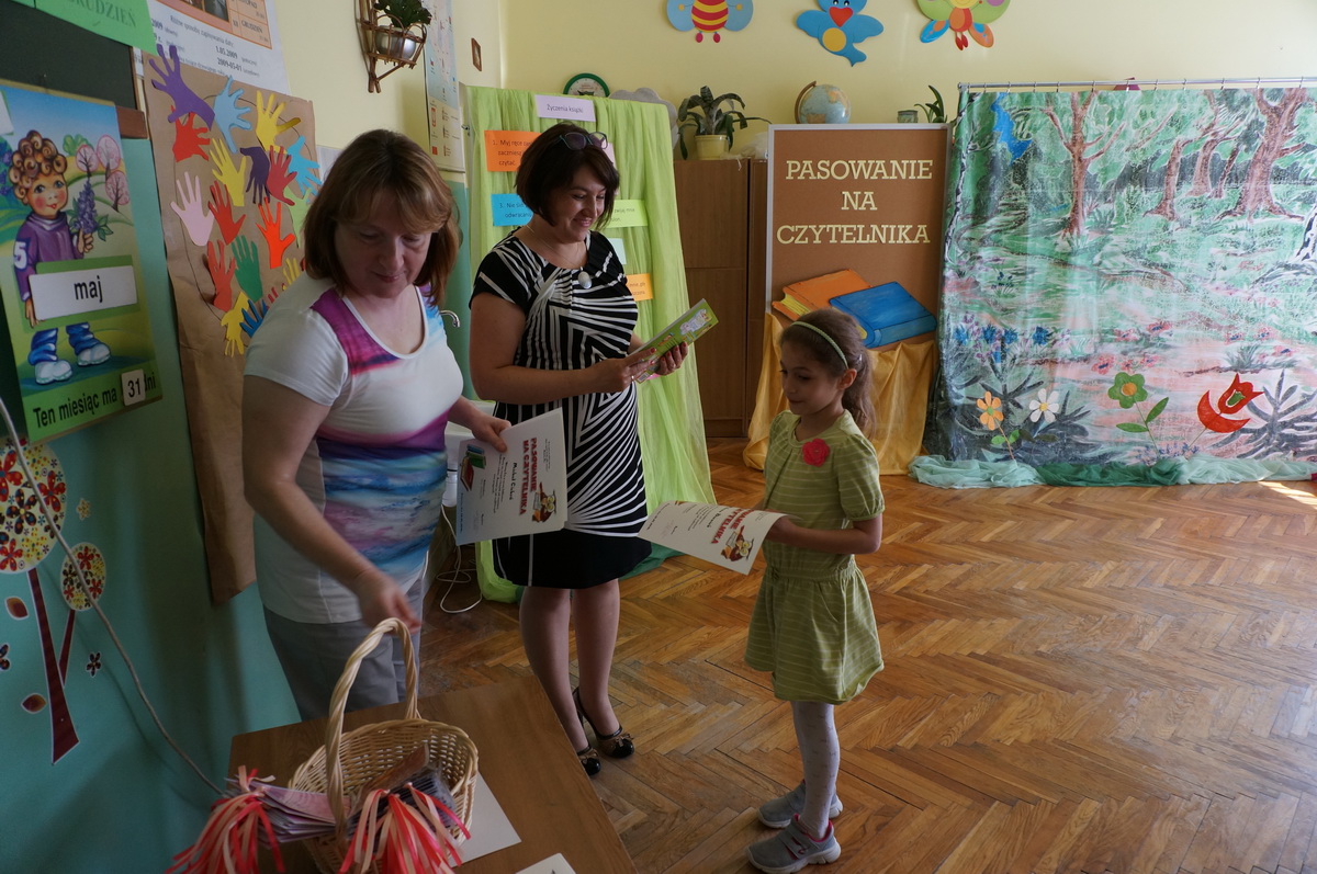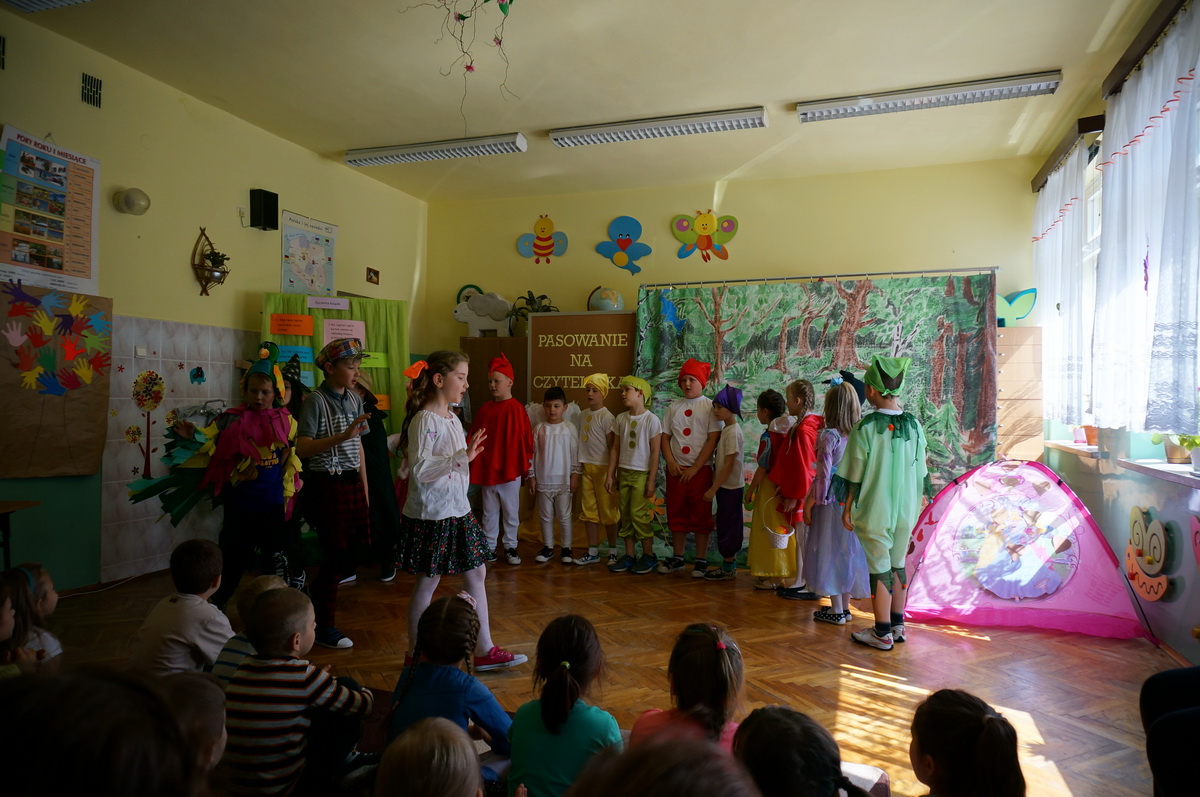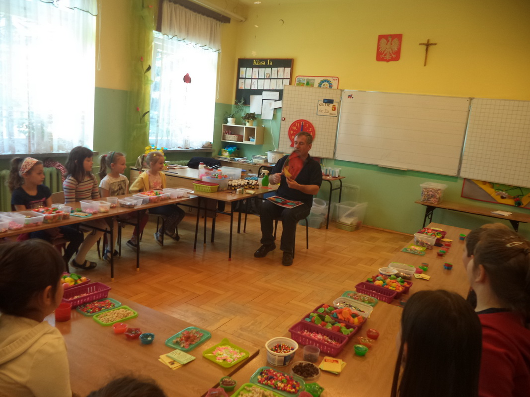 Pasowanie uczniów klas pierwszych na czytelników biblioteki na stałe wpisało się do kalendarza uroczystości szkolnych. Zazwyczaj uroczystość ta odbywa się w II semestrze, kiedy uczniowie znają już prawie cały alfabet. Pierwsze spotkanie z biblioteką szkolną to wyjątkowa uroczystość, a pierwsza wypożyczona książka powinna być na długo zapamiętana. Specjalnie na tę okazję została przygotowana krótka część artystyczna, pt.'' Spotkanie bajek" w wykonaniu uczniów z klasy IIa. Na scenie zobaczyliśmy między innymi krasnoludki, Jasia i Małgosię, Babę Jagę, Śnieżkę, Czerwonego Kapturka, wilka, Kopciuszka oraz Calineczkę. Uczniowie klas pierwszych doskonale poradzili sobiez bajkowymi zagadkami, które sprawdziły ich znajomość bohaterów baśni i bajek. Następnie pani Irena Bielawska zapoznała wszystkich z regulaminem biblioteki, przypominając o ważnych zasadach, które należy przestrzegać oraz sposobie wypożyczania. Skupione i poważne pierwszaki w obecności pani dyrektor Beaty Kowal i wice dyrektor Marii Skały uroczyście przyrzekły, że będą kochać i szanować książki, korzystać z ich mądrości i sumiennie wypełniać obowiązki czytelnika. Po przyrzeczeniu nastąpiło uroczyste pasowanie, którego dokonała pani dyrektor. Jednocześnie pogratulowała wszystkim uczniom i życzyła wspaniałych przygód w świecie książek. Wręczyła też pamiątkowe dyplomy oraz zakładki. Dnia 5 i 6 maja 2016r. odbyły się w naszej szkole warsztaty mydlarskie, w których udział wzięli uczniowie z klas 1-3. Mieli okazję dowiedzieć się jak wygląda produkcja mydła oraz wysłuchać historii jego powstania. Podczas zajęć uczestnicy samodzielnie wykonywali mydełka o rozmaitych zapachach, wzorach i kolorach. Wszyscy z ochotą tworzyli własne kompozycje zapachowe, wykorzystując do tego glicerynę, olejki zapachowe oraz elementy dekoracyjne. W całej szkole wspaniale pachniało, a pięknie zapakowane mydełka stanowiły oryginalny prezent.