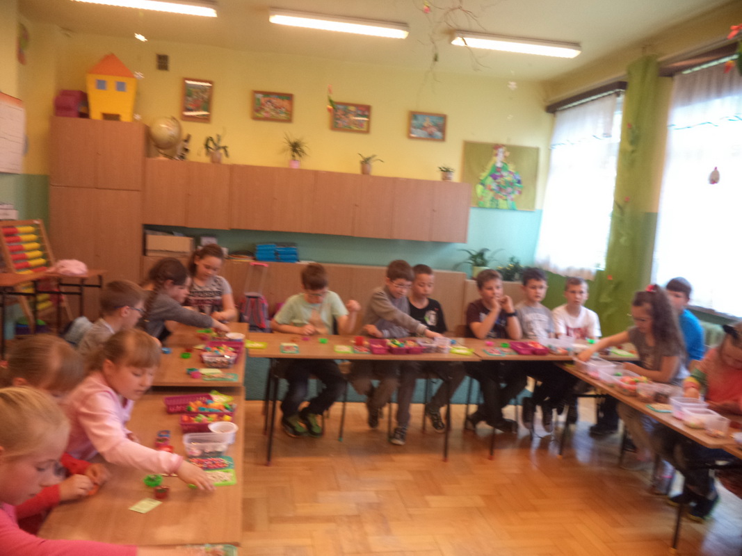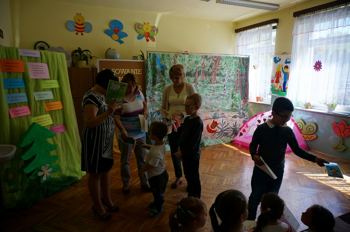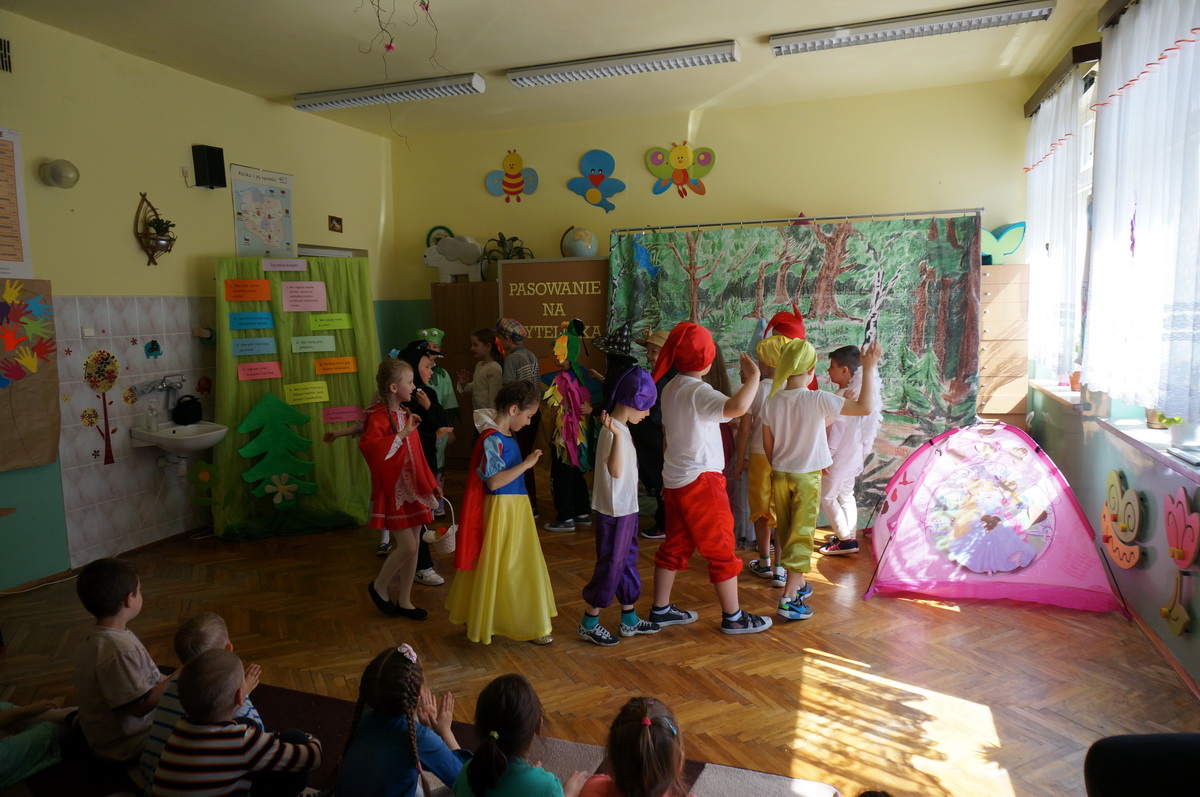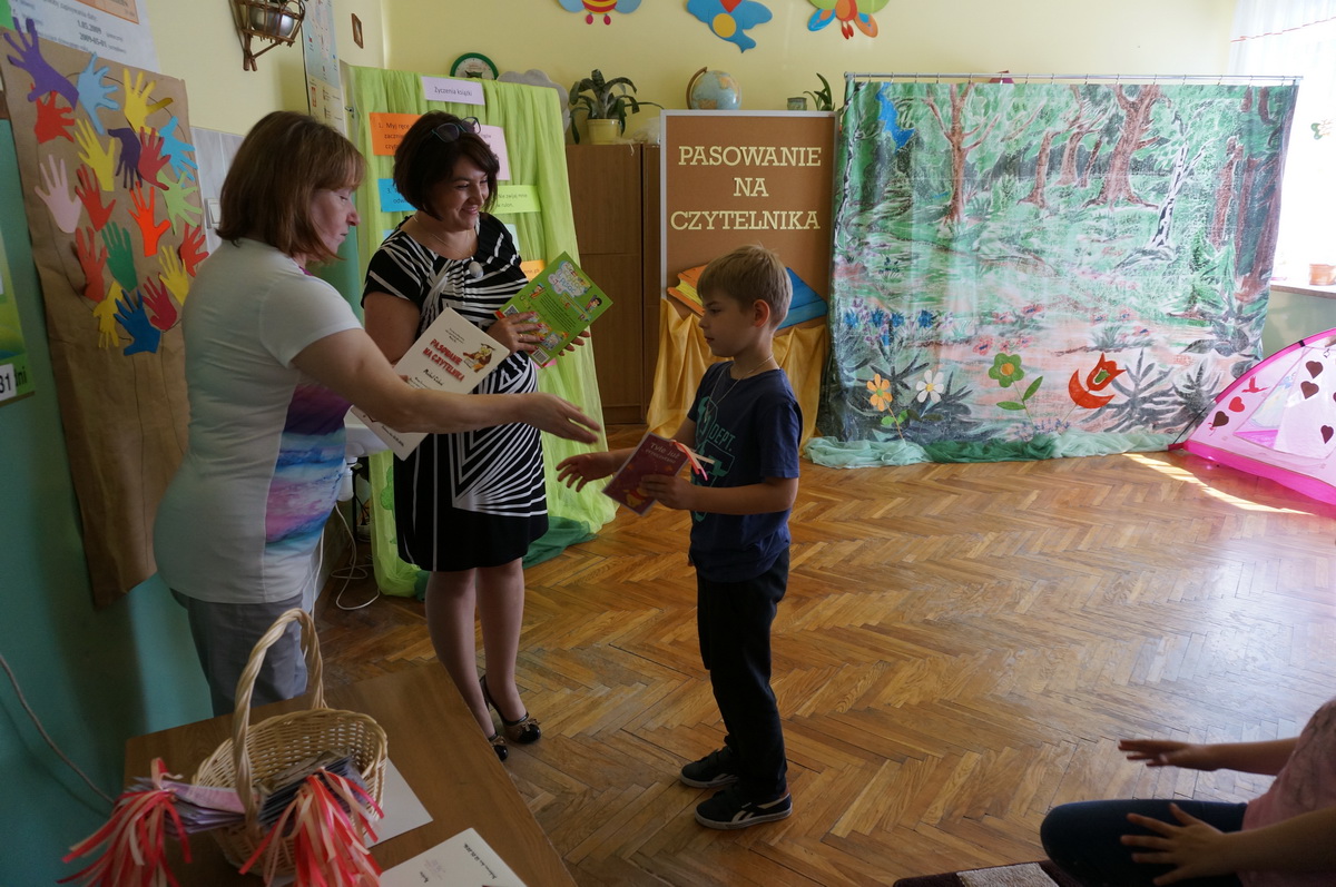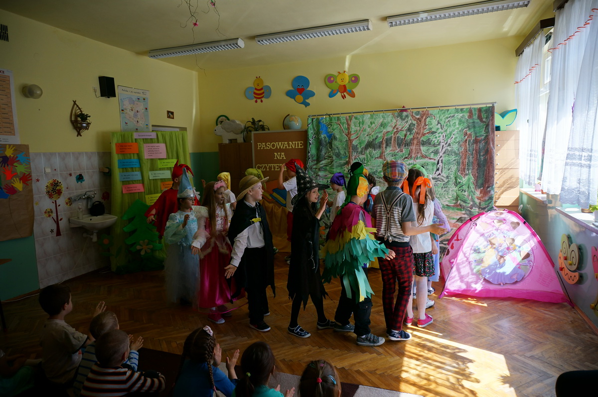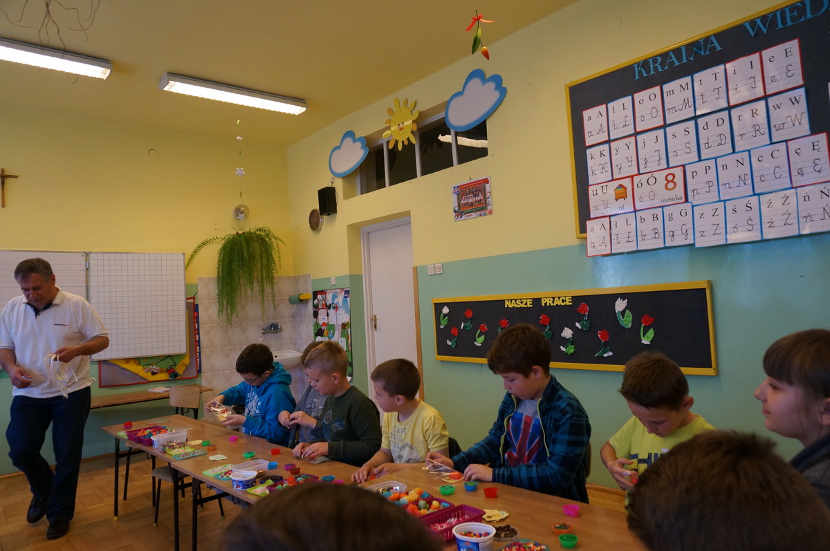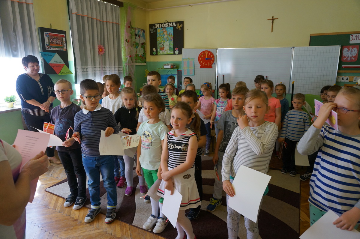 Pasowanie uczniów klas pierwszych na czytelników biblioteki na stałe wpisało się do kalendarza uroczystości szkolnych. Zazwyczaj uroczystość ta odbywa się w II semestrze, kiedy uczniowie znają już prawie cały alfabet. Pierwsze spotkanie z biblioteką szkolną to wyjątkowa uroczystość, a pierwsza wypożyczona książka powinna być na długo zapamiętana. Specjalnie na tę okazję została przygotowana krótka część artystyczna, pt.'' Spotkanie bajek" w wykonaniu uczniów z klasy IIa. Na scenie zobaczyliśmy między innymi krasnoludki, Jasia i Małgosię, Babę Jagę, Śnieżkę, Czerwonego Kapturka, wilka, Kopciuszka oraz Calineczkę. Uczniowie klas pierwszych doskonale poradzili sobiez bajkowymi zagadkami, które sprawdziły ich znajomość bohaterów baśni i bajek. Następnie pani Irena Bielawska zapoznała wszystkich z regulaminem biblioteki, przypominając o ważnych zasadach, które należy przestrzegać oraz sposobie wypożyczania. Skupione i poważne pierwszaki w obecności pani dyrektor Beaty Kowal i wice dyrektor Marii Skały uroczyście przyrzekły, że będą kochać i szanować książki, korzystać z ich mądrości i sumiennie wypełniać obowiązki czytelnika. Po przyrzeczeniu nastąpiło uroczyste pasowanie, którego dokonała pani dyrektor. Jednocześnie pogratulowała wszystkim uczniom i życzyła wspaniałych przygód w świecie książek. Wręczyła też pamiątkowe dyplomy oraz zakładki. Dnia 5 i 6 maja 2016r. odbyły się w naszej szkole warsztaty mydlarskie, w których udział wzięli uczniowie z klas 1-3. Mieli okazję dowiedzieć się jak wygląda produkcja mydła oraz wysłuchać historii jego powstania. Podczas zajęć uczestnicy samodzielnie wykonywali mydełka o rozmaitych zapachach, wzorach i kolorach. Wszyscy z ochotą tworzyli własne kompozycje zapachowe, wykorzystując do tego glicerynę, olejki zapachowe oraz elementy dekoracyjne. W całej szkole wspaniale pachniało, a pięknie zapakowane mydełka stanowiły oryginalny prezent.