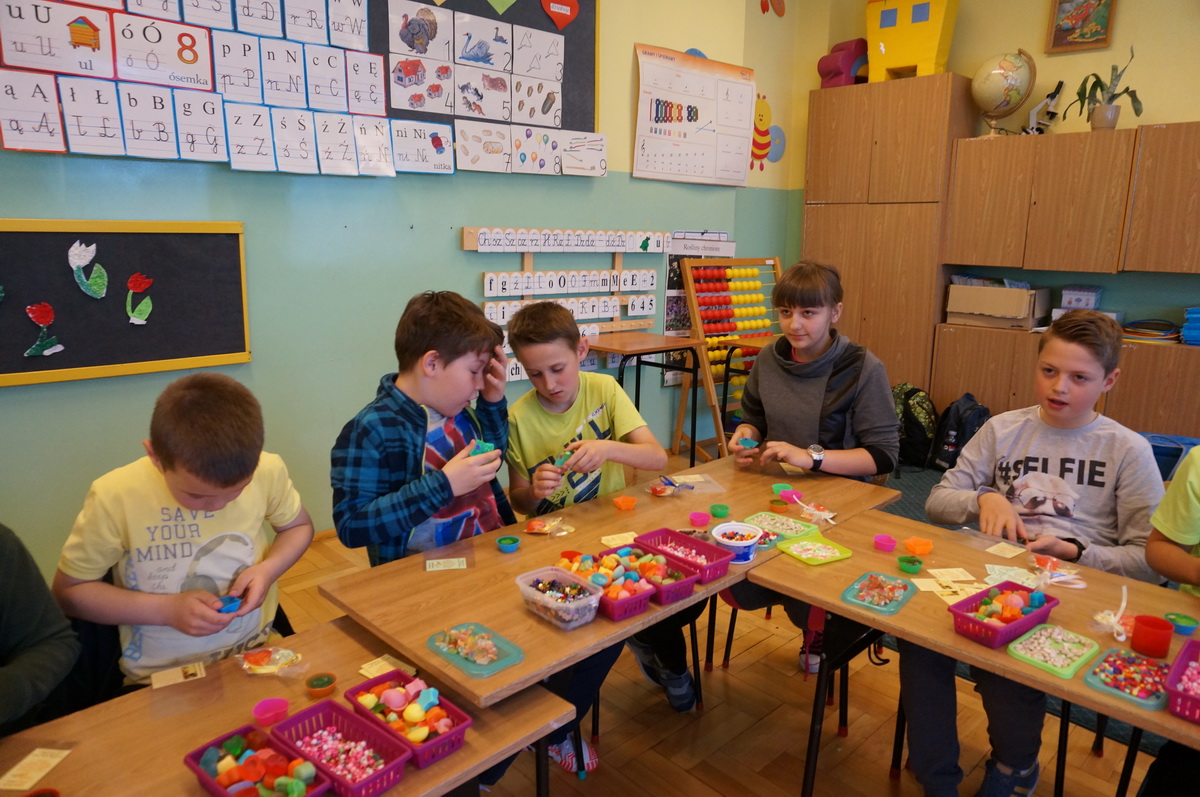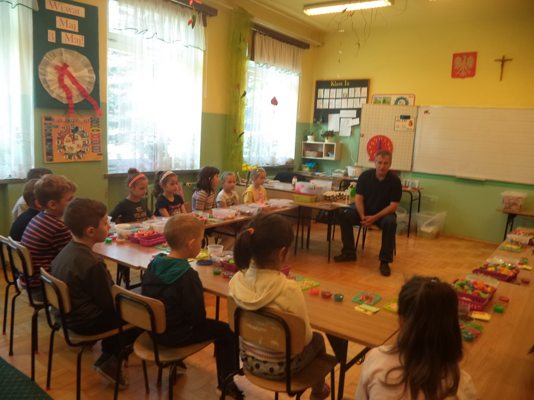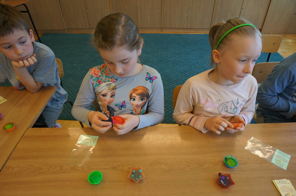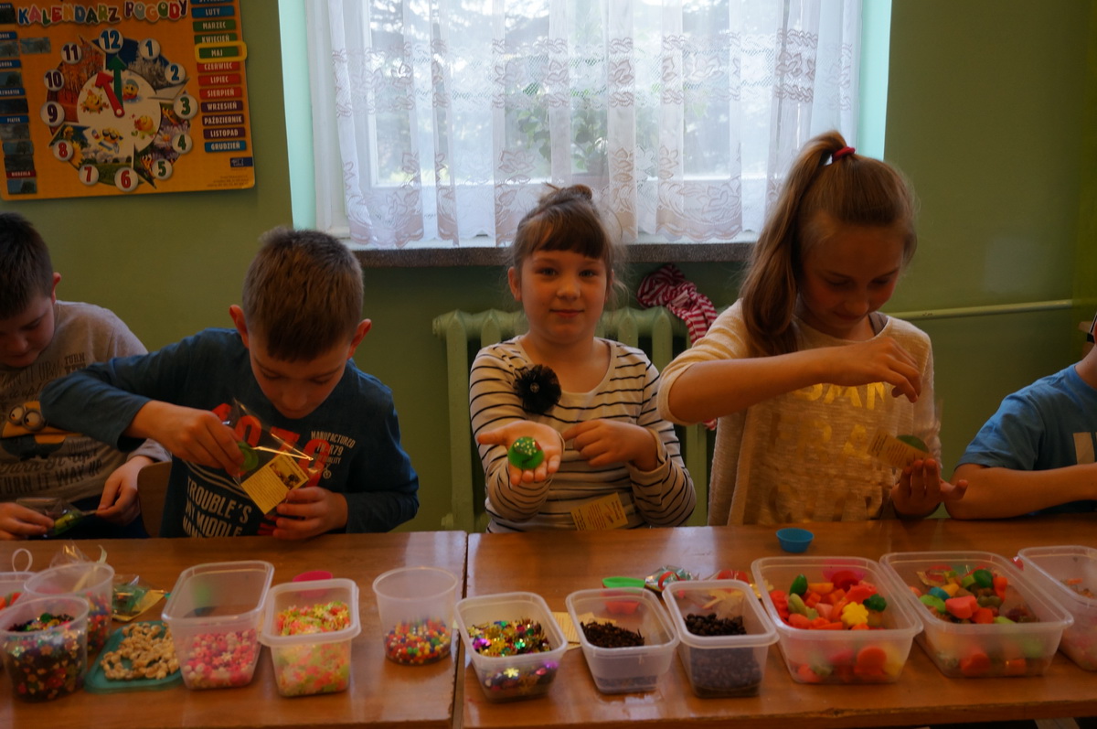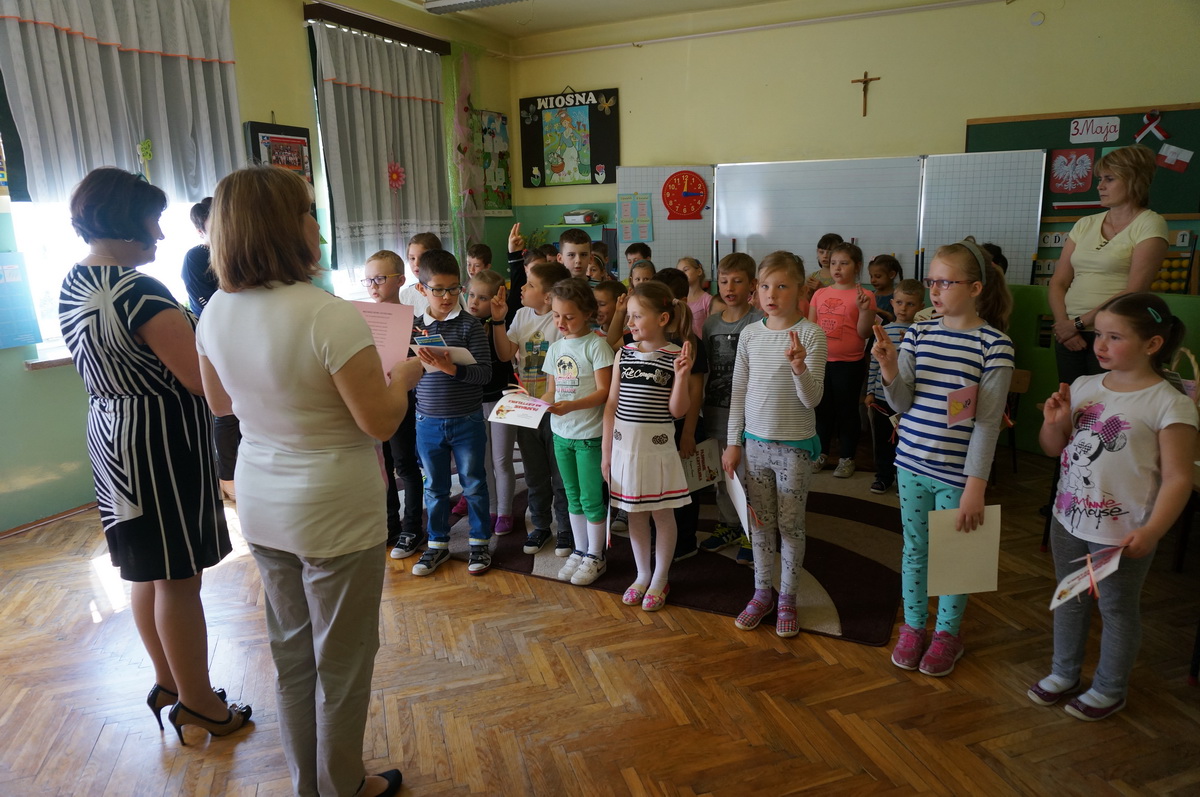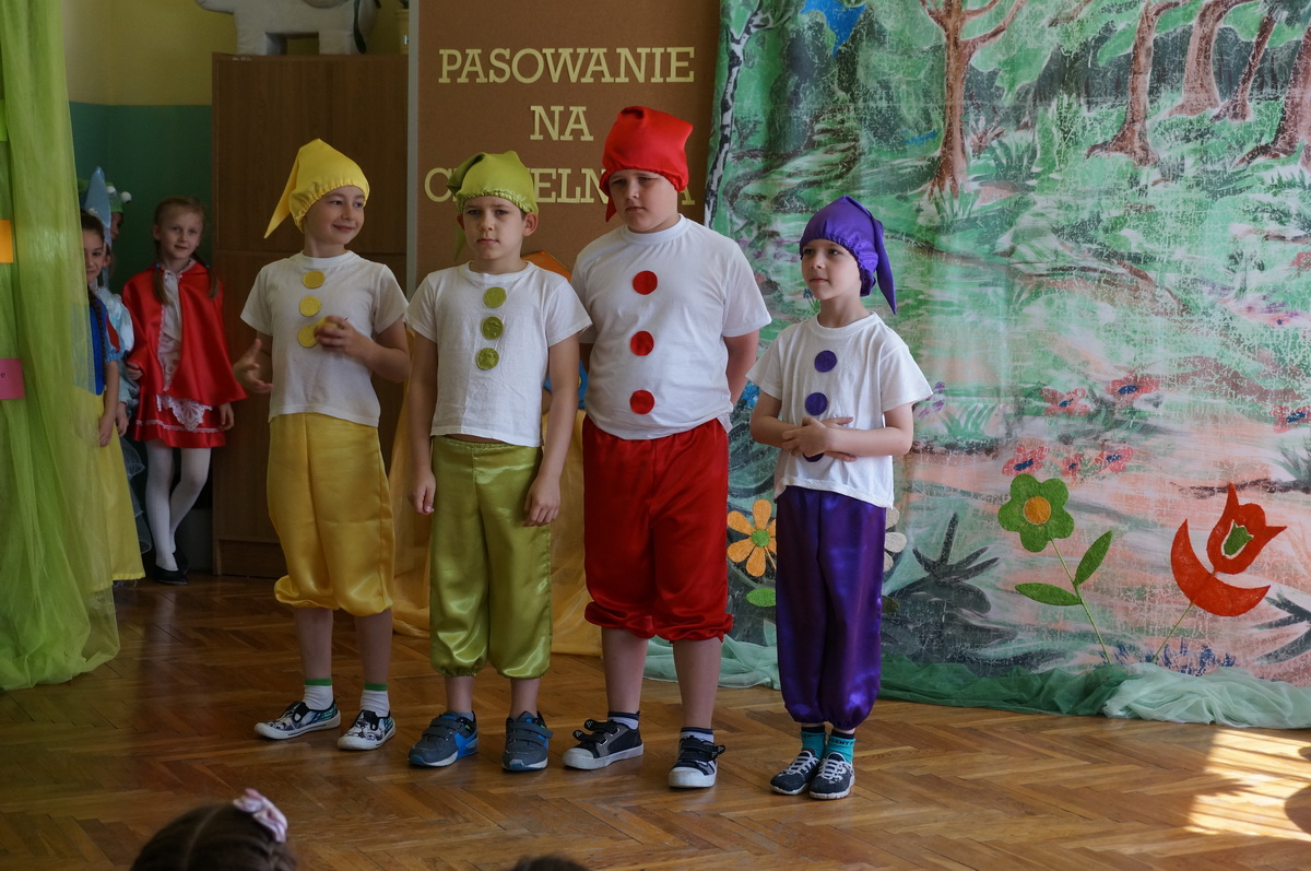 Pasowanie uczniów klas pierwszych na czytelników biblioteki na stałe wpisało się do kalendarza uroczystości szkolnych. Zazwyczaj uroczystość ta odbywa się w II semestrze, kiedy uczniowie znają już prawie cały alfabet. Pierwsze spotkanie z biblioteką szkolną to wyjątkowa uroczystość, a pierwsza wypożyczona książka powinna być na długo zapamiętana. Specjalnie na tę okazję została przygotowana krótka część artystyczna, pt.'' Spotkanie bajek" w wykonaniu uczniów z klasy IIa. Na scenie zobaczyliśmy między innymi krasnoludki, Jasia i Małgosię, Babę Jagę, Śnieżkę, Czerwonego Kapturka, wilka, Kopciuszka oraz Calineczkę. Uczniowie klas pierwszych doskonale poradzili sobiez bajkowymi zagadkami, które sprawdziły ich znajomość bohaterów baśni i bajek. Następnie pani Irena Bielawska zapoznała wszystkich z regulaminem biblioteki, przypominając o ważnych zasadach, które należy przestrzegać oraz sposobie wypożyczania. Skupione i poważne pierwszaki w obecności pani dyrektor Beaty Kowal i wice dyrektor Marii Skały uroczyście przyrzekły, że będą kochać i szanować książki, korzystać z ich mądrości i sumiennie wypełniać obowiązki czytelnika. Po przyrzeczeniu nastąpiło uroczyste pasowanie, którego dokonała pani dyrektor. Jednocześnie pogratulowała wszystkim uczniom i życzyła wspaniałych przygód w świecie książek. Wręczyła też pamiątkowe dyplomy oraz zakładki. Dnia 5 i 6 maja 2016r. odbyły się w naszej szkole warsztaty mydlarskie, w których udział wzięli uczniowie z klas 1-3. Mieli okazję dowiedzieć się jak wygląda produkcja mydła oraz wysłuchać historii jego powstania. Podczas zajęć uczestnicy samodzielnie wykonywali mydełka o rozmaitych zapachach, wzorach i kolorach. Wszyscy z ochotą tworzyli własne kompozycje zapachowe, wykorzystując do tego glicerynę, olejki zapachowe oraz elementy dekoracyjne. W całej szkole wspaniale pachniało, a pięknie zapakowane mydełka stanowiły oryginalny prezent.