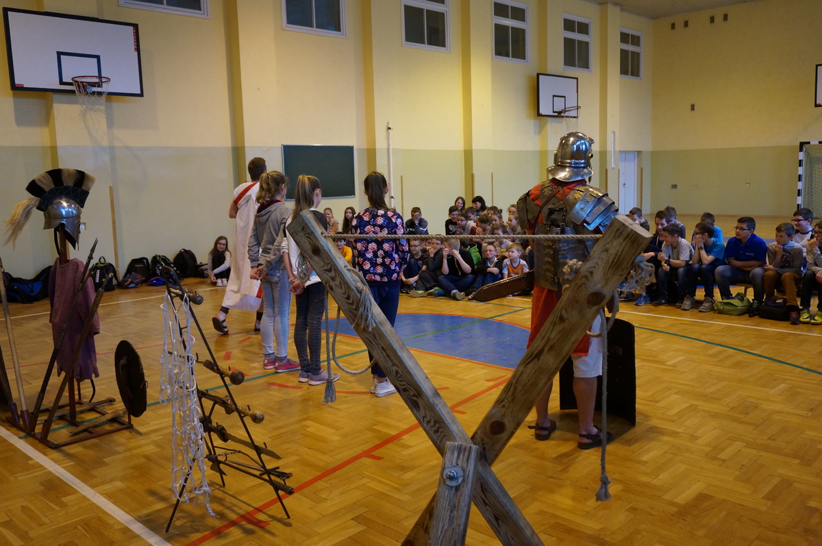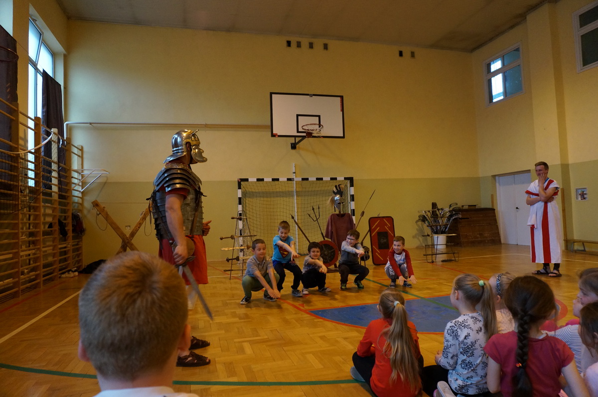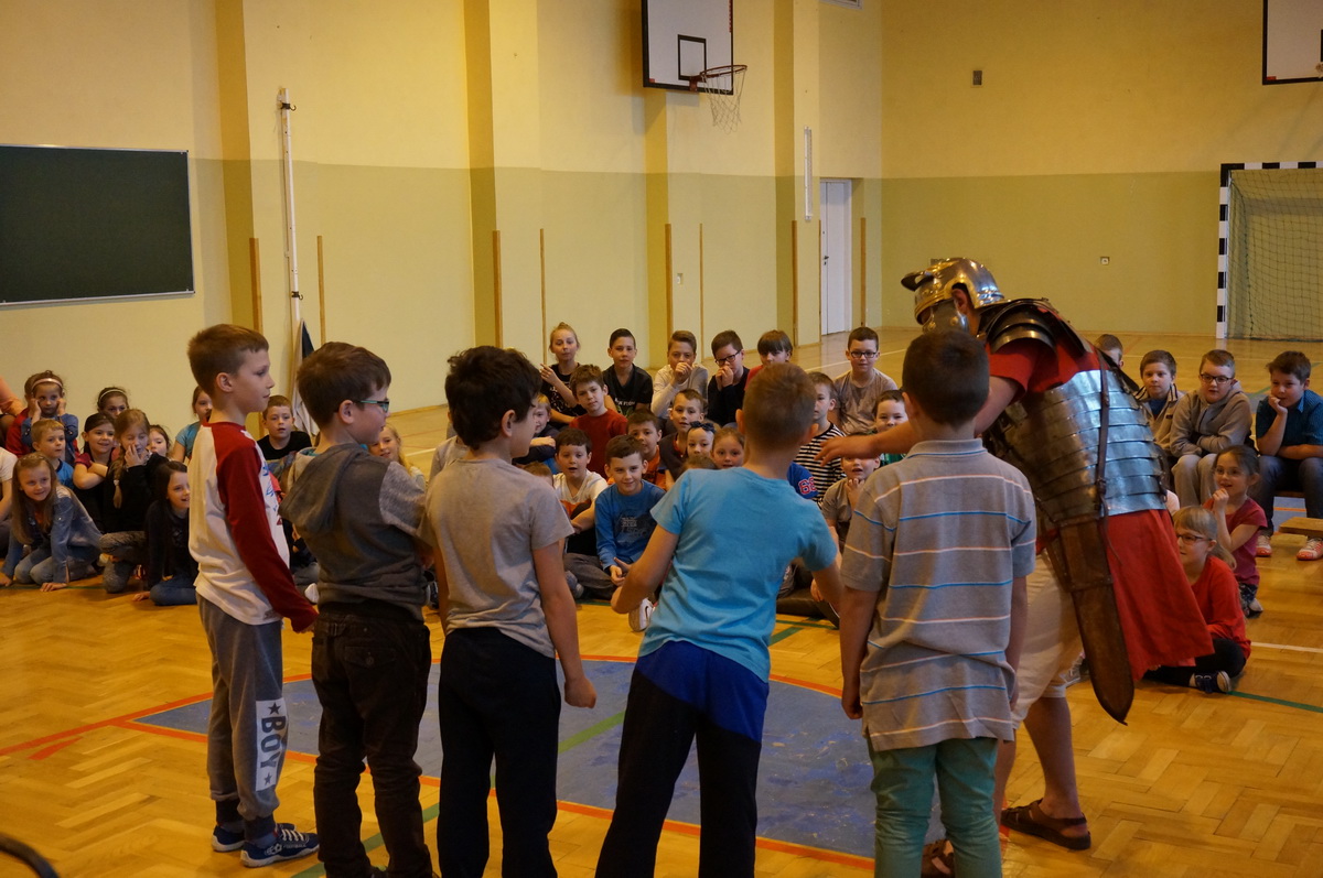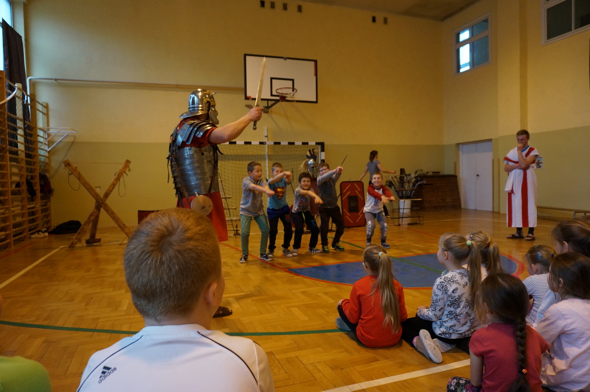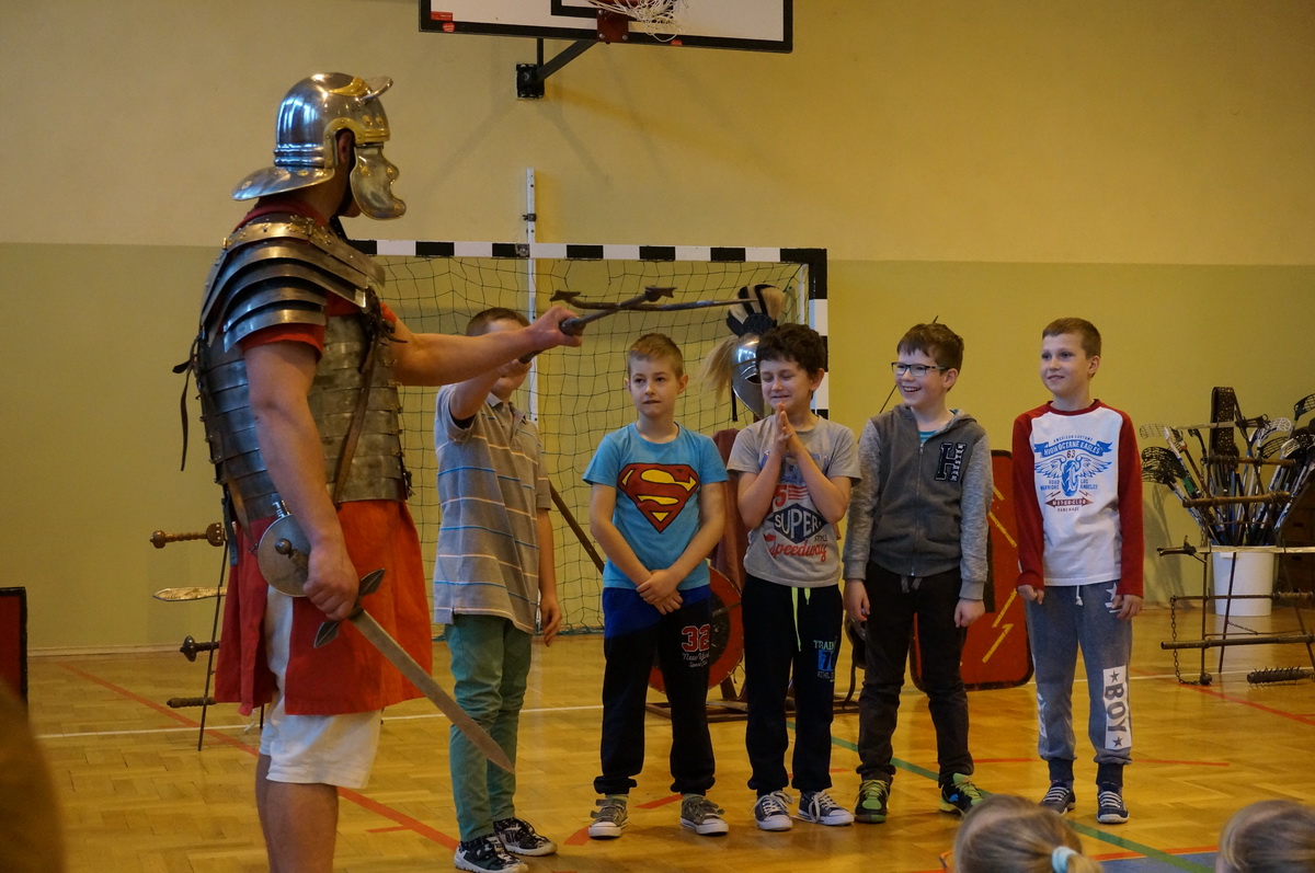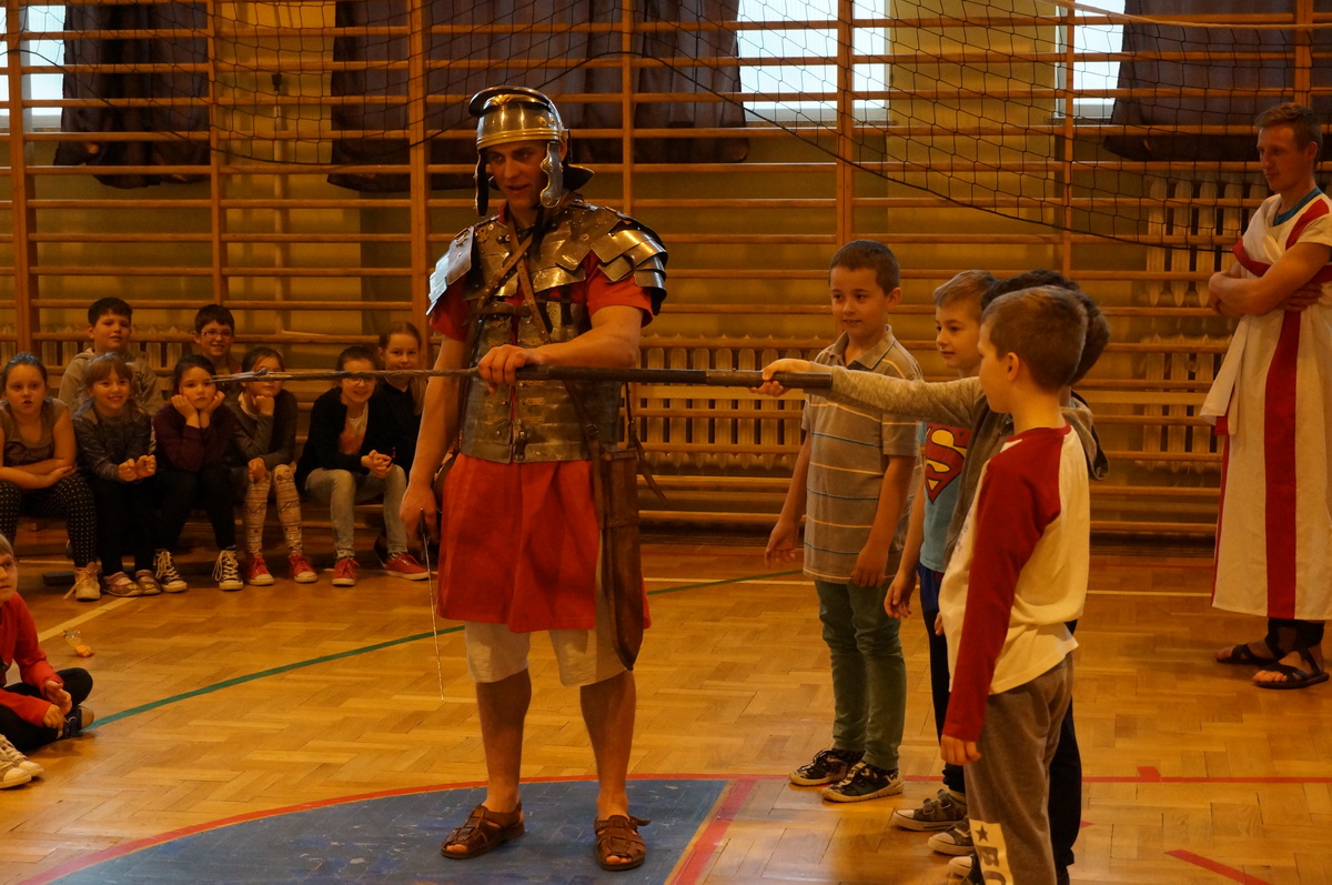 Dnia 8. kwietnia 2016r. w naszej szkole odbyła się niezwykła lekcja historii. W podróż w czasie zabrała uczniów klas I-VI SP grupa historyczna "Rekonstrukto". Nasza szkoła stała się rzymską prowincją, Wszyscy uczniowie dowiedzieli się, że od tego momentu zostali poddanymi cesarza, a jego władzy sprzeciwiać się im nie wolno. Niektórzy z naszych dzielnych chłopców spróbowali swych sił jako wojownicy rzymskiej centurii. Przeszli prawdziwe wojskowe przeszkolenie, poznając tajniki ówczesnego uzbrojenia oraz taktykę walki. Ustawieni w szyku zbrojnym zwanym taktyką żółwia pokazali swym kolegom w jaki sposób Rzymianie wygrywali bitwy. Grupa "Rekonstrukto" zademonstrowała nie tylko zbroje i rodzaje broni starożytnych legionistów, przeniosła uczniów także na arenę walk gladiatorów i zapoznała z okrutnym rzymskim prawem i karami. Taka lekcja historii bardzo spodobała się naszym uczniom. Rekwizyty w postaci różnych rodzajów bronii oraz żywe i dowcipne opowieści panów z grupy "Rekonstrukto" skutecznie pobudziły wyobraźnię uczniów, dzięki czemu zdobyta w ten sposób wiedza z pewnością na długo pozostanie w ich pamięci.