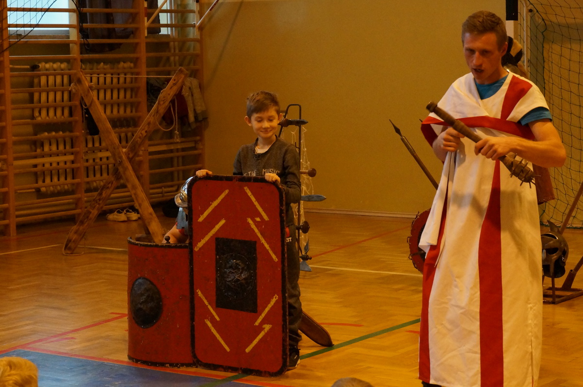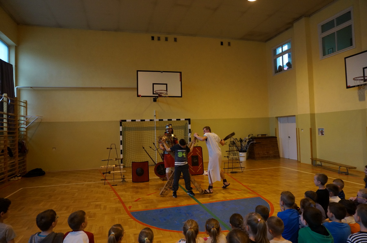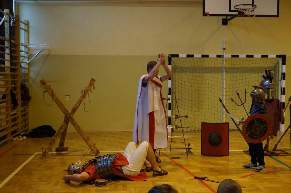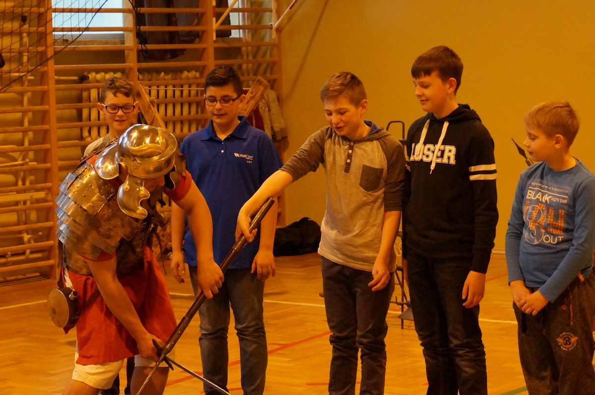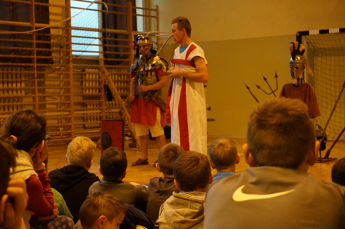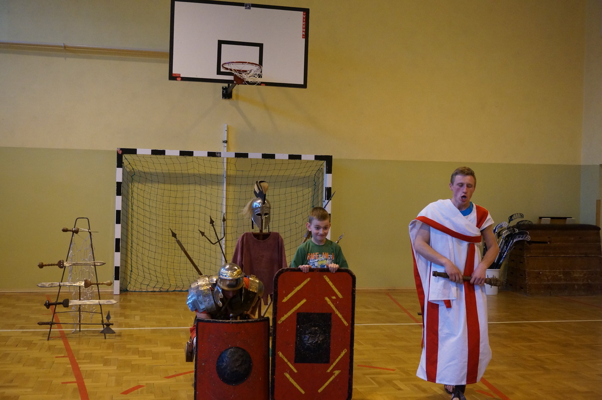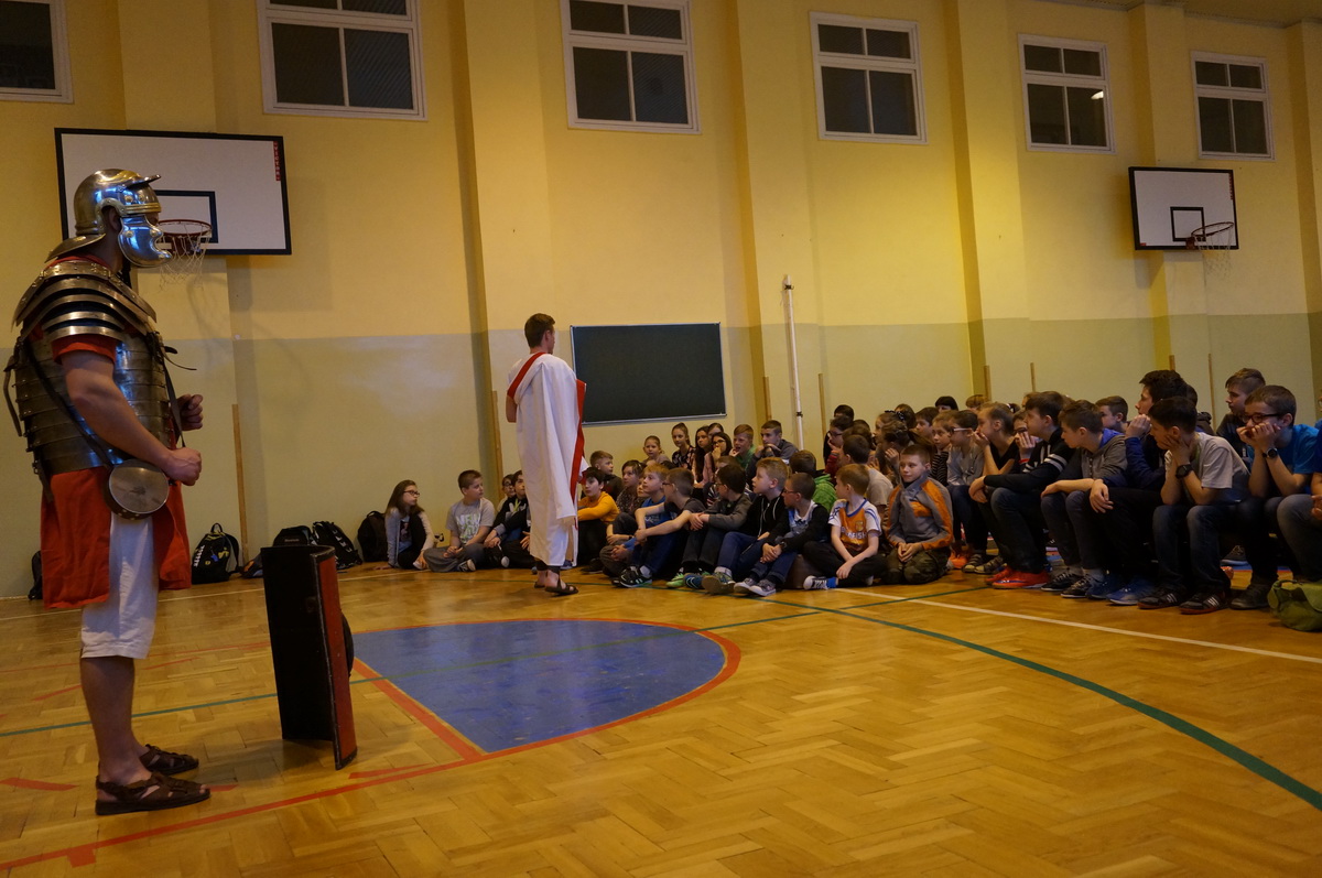 Dnia 8. kwietnia 2016r. w naszej szkole odbyła się niezwykła lekcja historii. W podróż w czasie zabrała uczniów klas I-VI SP grupa historyczna "Rekonstrukto". Nasza szkoła stała się rzymską prowincją, Wszyscy uczniowie dowiedzieli się, że od tego momentu zostali poddanymi cesarza, a jego władzy sprzeciwiać się im nie wolno. Niektórzy z naszych dzielnych chłopców spróbowali swych sił jako wojownicy rzymskiej centurii. Przeszli prawdziwe wojskowe przeszkolenie, poznając tajniki ówczesnego uzbrojenia oraz taktykę walki. Ustawieni w szyku zbrojnym zwanym taktyką żółwia pokazali swym kolegom w jaki sposób Rzymianie wygrywali bitwy. Grupa "Rekonstrukto" zademonstrowała nie tylko zbroje i rodzaje broni starożytnych legionistów, przeniosła uczniów także na arenę walk gladiatorów i zapoznała z okrutnym rzymskim prawem i karami. Taka lekcja historii bardzo spodobała się naszym uczniom. Rekwizyty w postaci różnych rodzajów bronii oraz żywe i dowcipne opowieści panów z grupy "Rekonstrukto" skutecznie pobudziły wyobraźnię uczniów, dzięki czemu zdobyta w ten sposób wiedza z pewnością na długo pozostanie w ich pamięci.