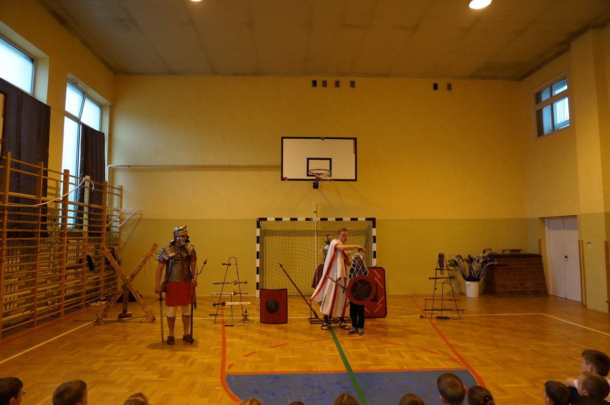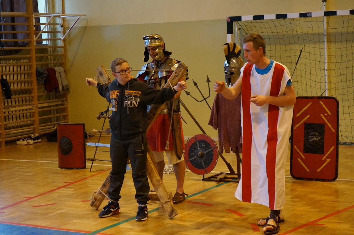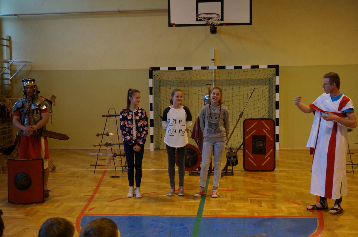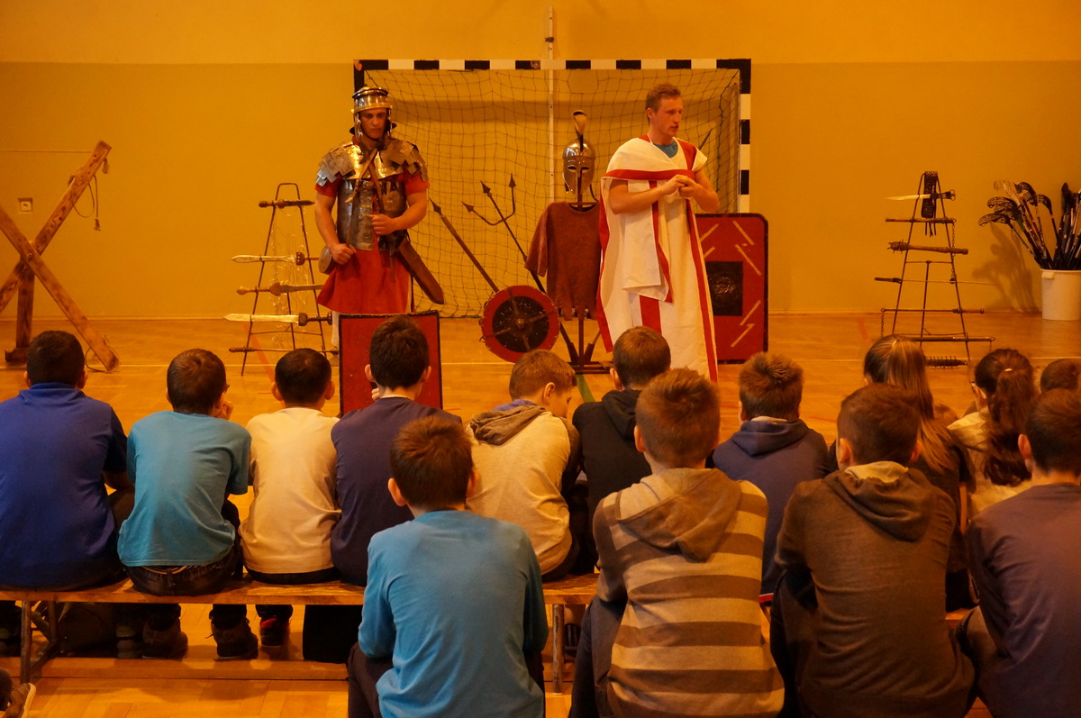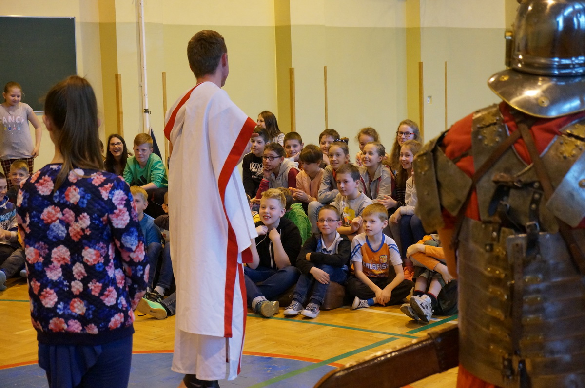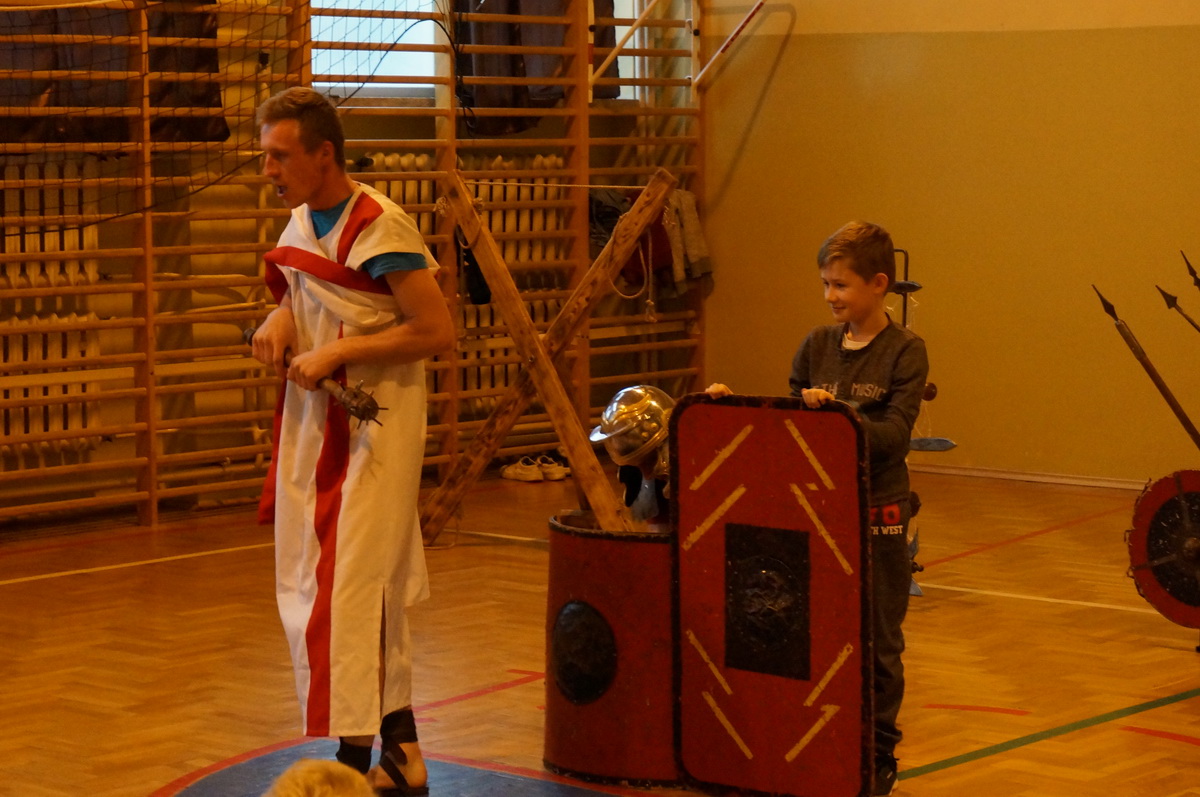 Dnia 8. kwietnia 2016r. w naszej szkole odbyła się niezwykła lekcja historii. W podróż w czasie zabrała uczniów klas I-VI SP grupa historyczna "Rekonstrukto". Nasza szkoła stała się rzymską prowincją, Wszyscy uczniowie dowiedzieli się, że od tego momentu zostali poddanymi cesarza, a jego władzy sprzeciwiać się im nie wolno. Niektórzy z naszych dzielnych chłopców spróbowali swych sił jako wojownicy rzymskiej centurii. Przeszli prawdziwe wojskowe przeszkolenie, poznając tajniki ówczesnego uzbrojenia oraz taktykę walki. Ustawieni w szyku zbrojnym zwanym taktyką żółwia pokazali swym kolegom w jaki sposób Rzymianie wygrywali bitwy. Grupa "Rekonstrukto" zademonstrowała nie tylko zbroje i rodzaje broni starożytnych legionistów, przeniosła uczniów także na arenę walk gladiatorów i zapoznała z okrutnym rzymskim prawem i karami. Taka lekcja historii bardzo spodobała się naszym uczniom. Rekwizyty w postaci różnych rodzajów bronii oraz żywe i dowcipne opowieści panów z grupy "Rekonstrukto" skutecznie pobudziły wyobraźnię uczniów, dzięki czemu zdobyta w ten sposób wiedza z pewnością na długo pozostanie w ich pamięci.