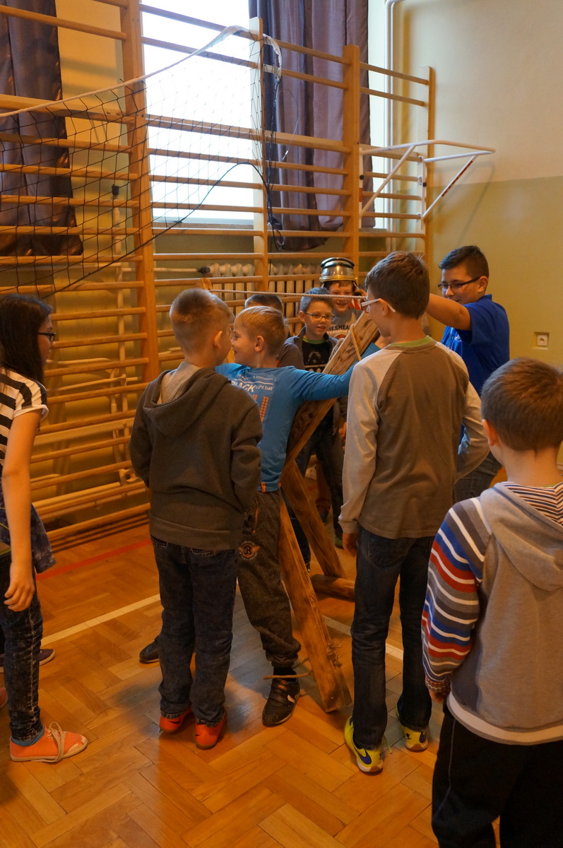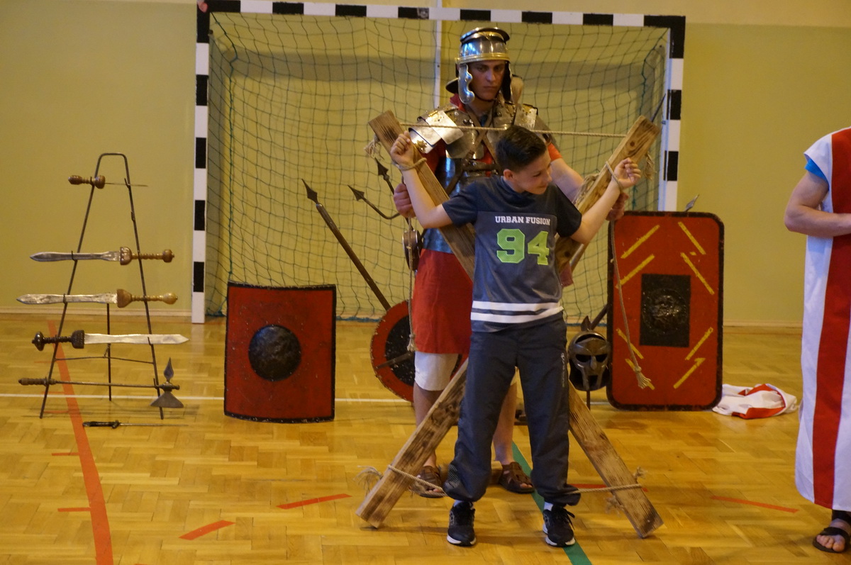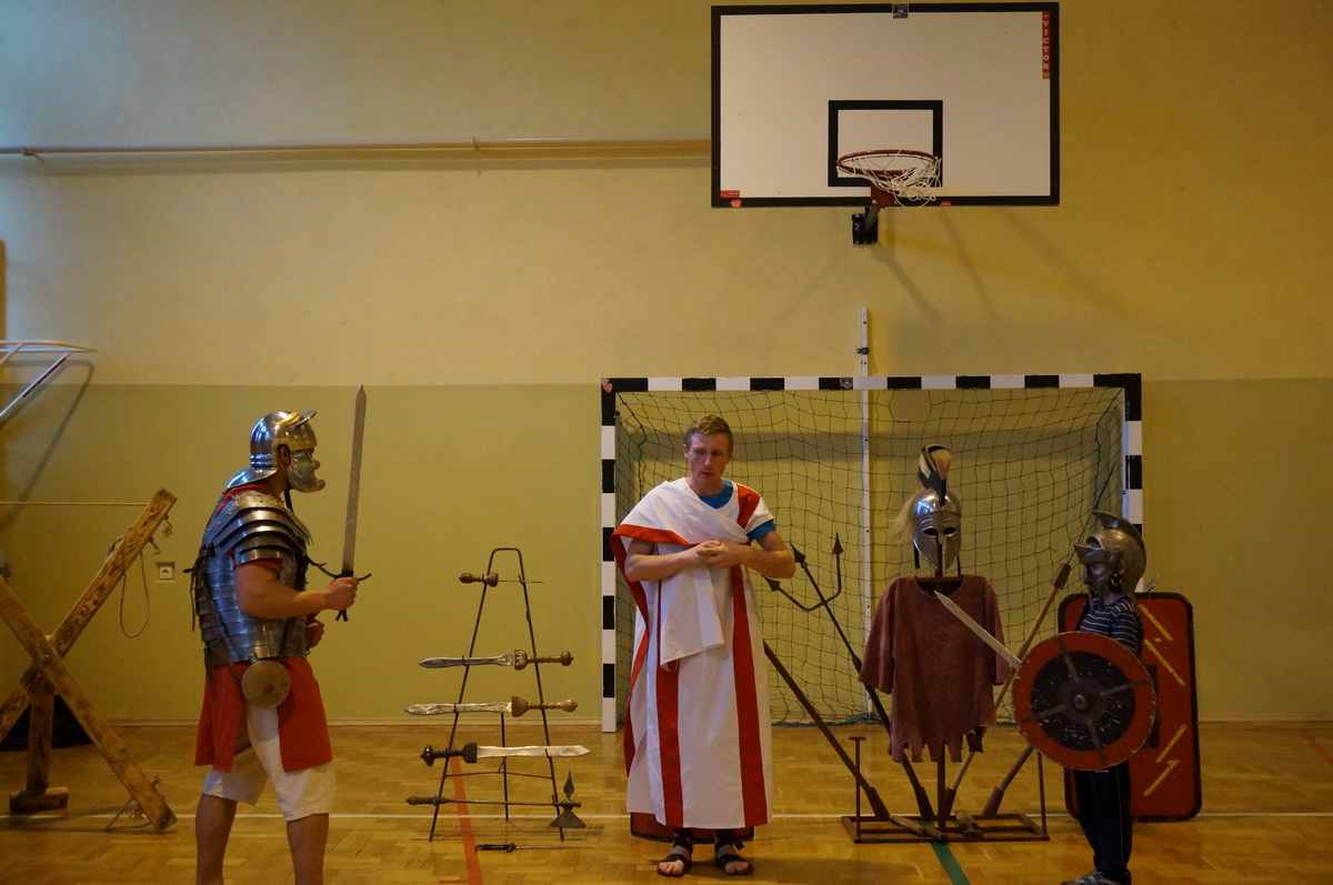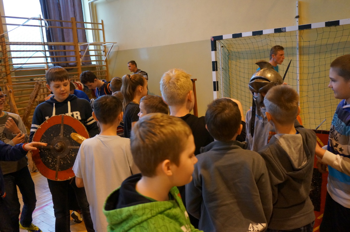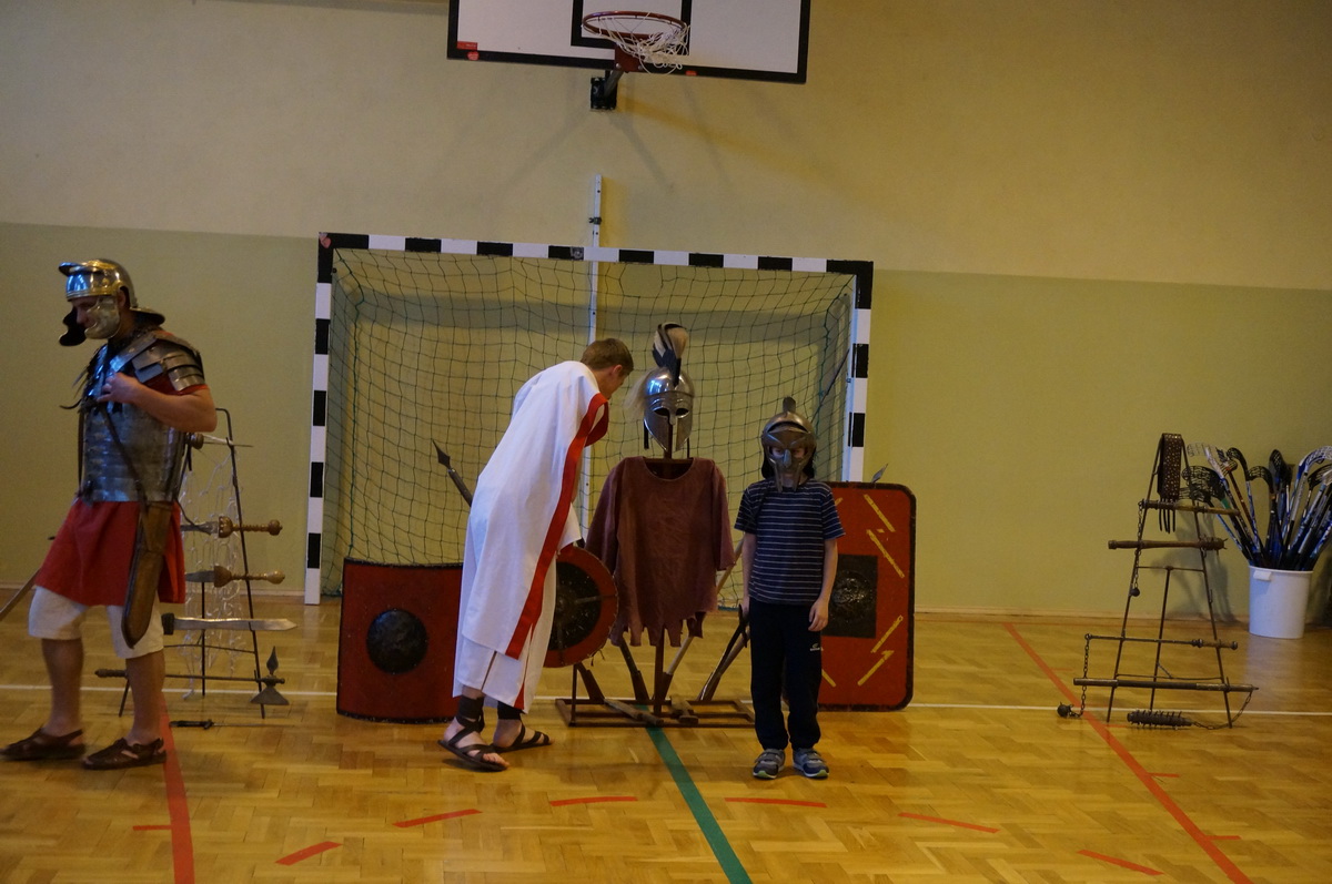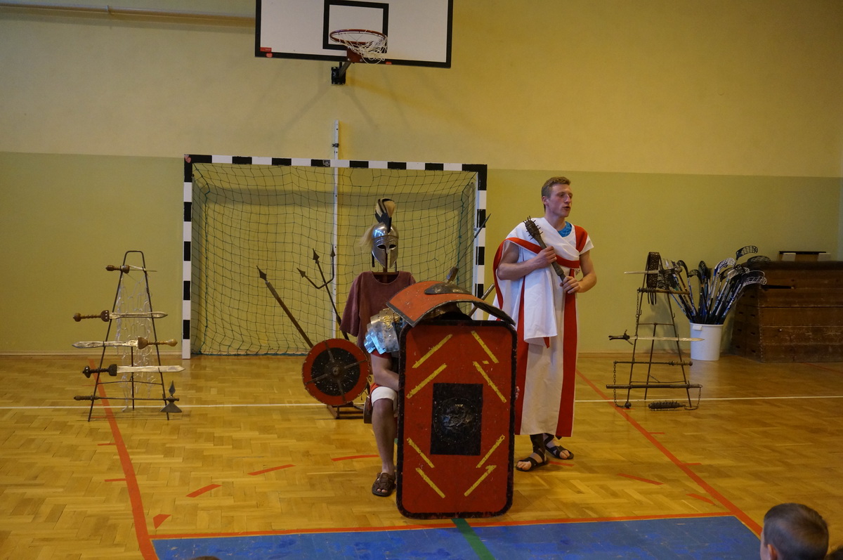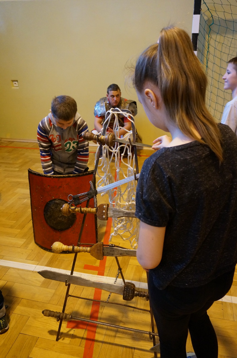 Dnia 8. kwietnia 2016r. w naszej szkole odbyła się niezwykła lekcja historii. W podróż w czasie zabrała uczniów klas I-VI SP grupa historyczna "Rekonstrukto". Nasza szkoła stała się rzymską prowincją, Wszyscy uczniowie dowiedzieli się, że od tego momentu zostali poddanymi cesarza, a jego władzy sprzeciwiać się im nie wolno. Niektórzy z naszych dzielnych chłopców spróbowali swych sił jako wojownicy rzymskiej centurii. Przeszli prawdziwe wojskowe przeszkolenie, poznając tajniki ówczesnego uzbrojenia oraz taktykę walki. Ustawieni w szyku zbrojnym zwanym taktyką żółwia pokazali swym kolegom w jaki sposób Rzymianie wygrywali bitwy. Grupa "Rekonstrukto" zademonstrowała nie tylko zbroje i rodzaje broni starożytnych legionistów, przeniosła uczniów także na arenę walk gladiatorów i zapoznała z okrutnym rzymskim prawem i karami. Taka lekcja historii bardzo spodobała się naszym uczniom. Rekwizyty w postaci różnych rodzajów bronii oraz żywe i dowcipne opowieści panów z grupy "Rekonstrukto" skutecznie pobudziły wyobraźnię uczniów, dzięki czemu zdobyta w ten sposób wiedza z pewnością na długo pozostanie w ich pamięci.