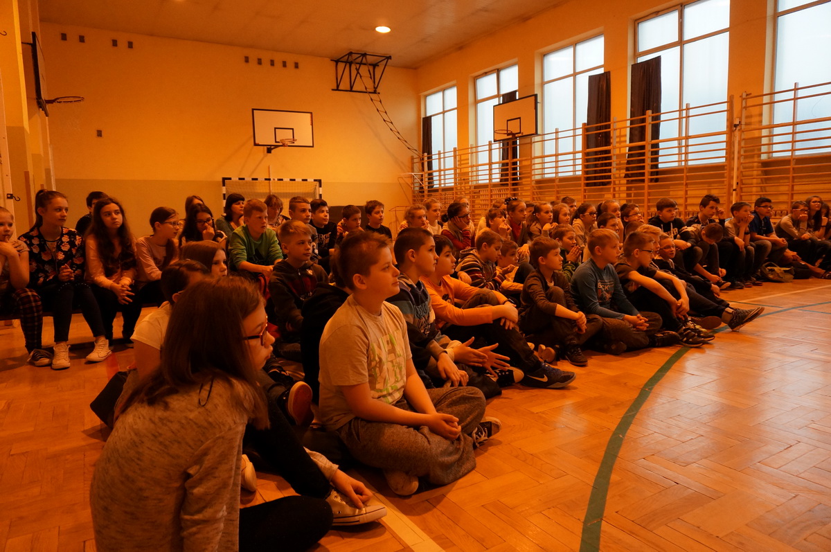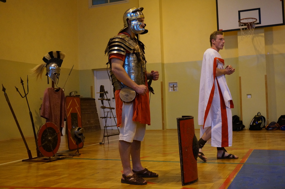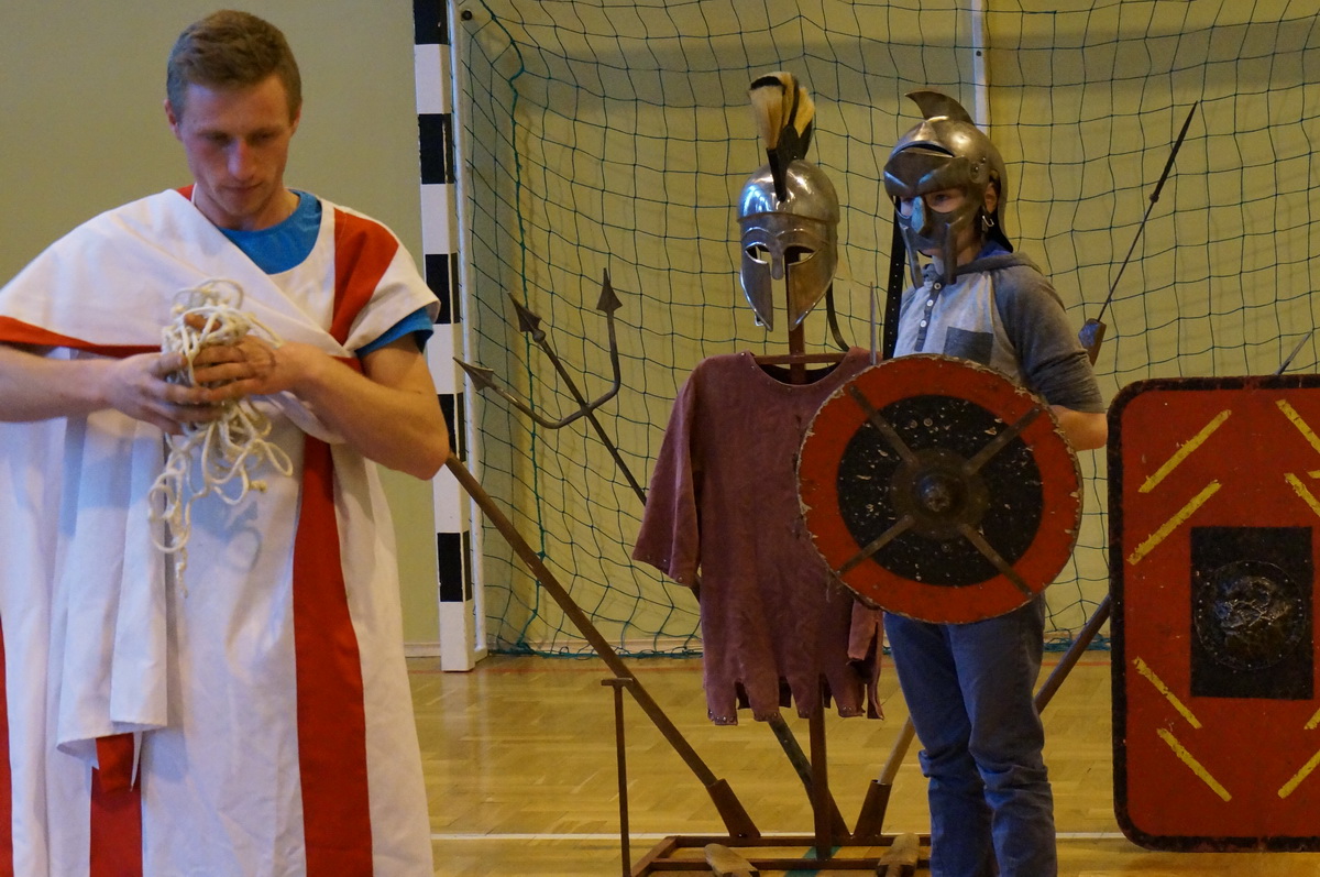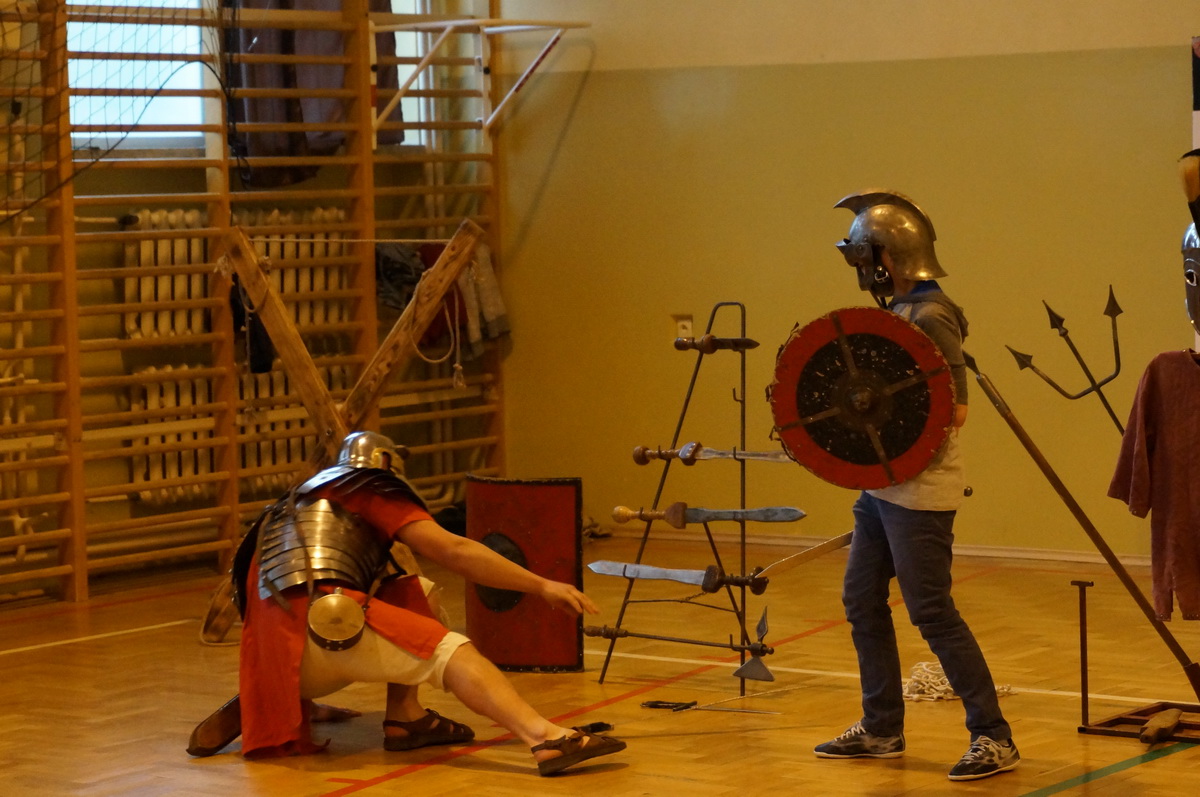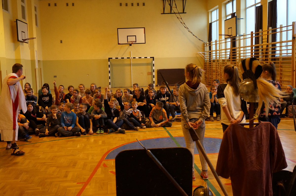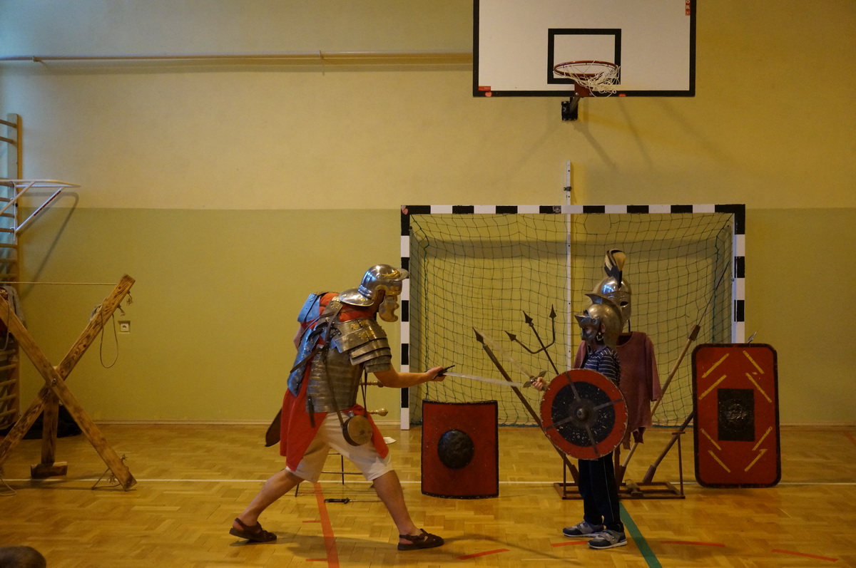 Dnia 8. kwietnia 2016r. w naszej szkole odbyła się niezwykła lekcja historii. W podróż w czasie zabrała uczniów klas I-VI SP grupa historyczna "Rekonstrukto". Nasza szkoła stała się rzymską prowincją, Wszyscy uczniowie dowiedzieli się, że od tego momentu zostali poddanymi cesarza, a jego władzy sprzeciwiać się im nie wolno. Niektórzy z naszych dzielnych chłopców spróbowali swych sił jako wojownicy rzymskiej centurii. Przeszli prawdziwe wojskowe przeszkolenie, poznając tajniki ówczesnego uzbrojenia oraz taktykę walki. Ustawieni w szyku zbrojnym zwanym taktyką żółwia pokazali swym kolegom w jaki sposób Rzymianie wygrywali bitwy. Grupa "Rekonstrukto" zademonstrowała nie tylko zbroje i rodzaje broni starożytnych legionistów, przeniosła uczniów także na arenę walk gladiatorów i zapoznała z okrutnym rzymskim prawem i karami. Taka lekcja historii bardzo spodobała się naszym uczniom. Rekwizyty w postaci różnych rodzajów bronii oraz żywe i dowcipne opowieści panów z grupy "Rekonstrukto" skutecznie pobudziły wyobraźnię uczniów, dzięki czemu zdobyta w ten sposób wiedza z pewnością na długo pozostanie w ich pamięci.