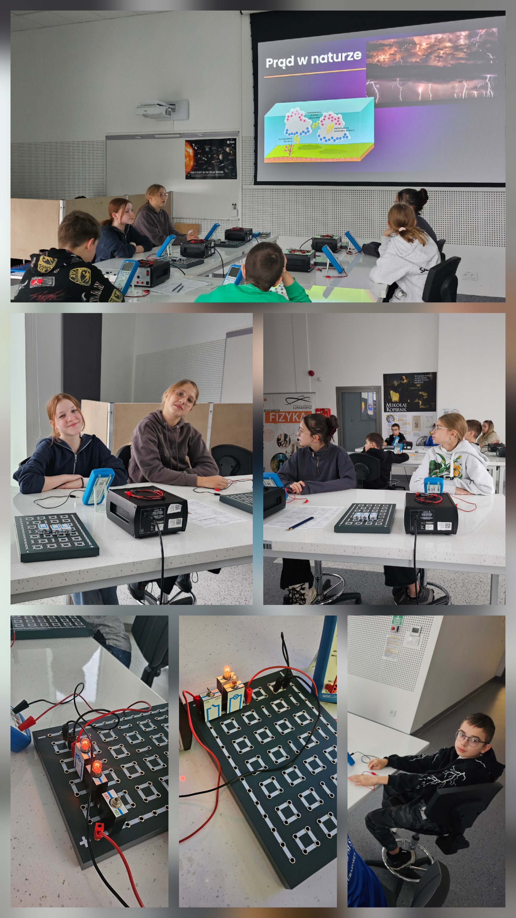 Podczas zajęć uczniowie samodzielnie eksperymentowali z obwodami szeregowymi i równoległymi, obserwowali działanie prądu oraz praktycznie posługiwali się multimetrem, poznając prawa fizyki w praktyce.